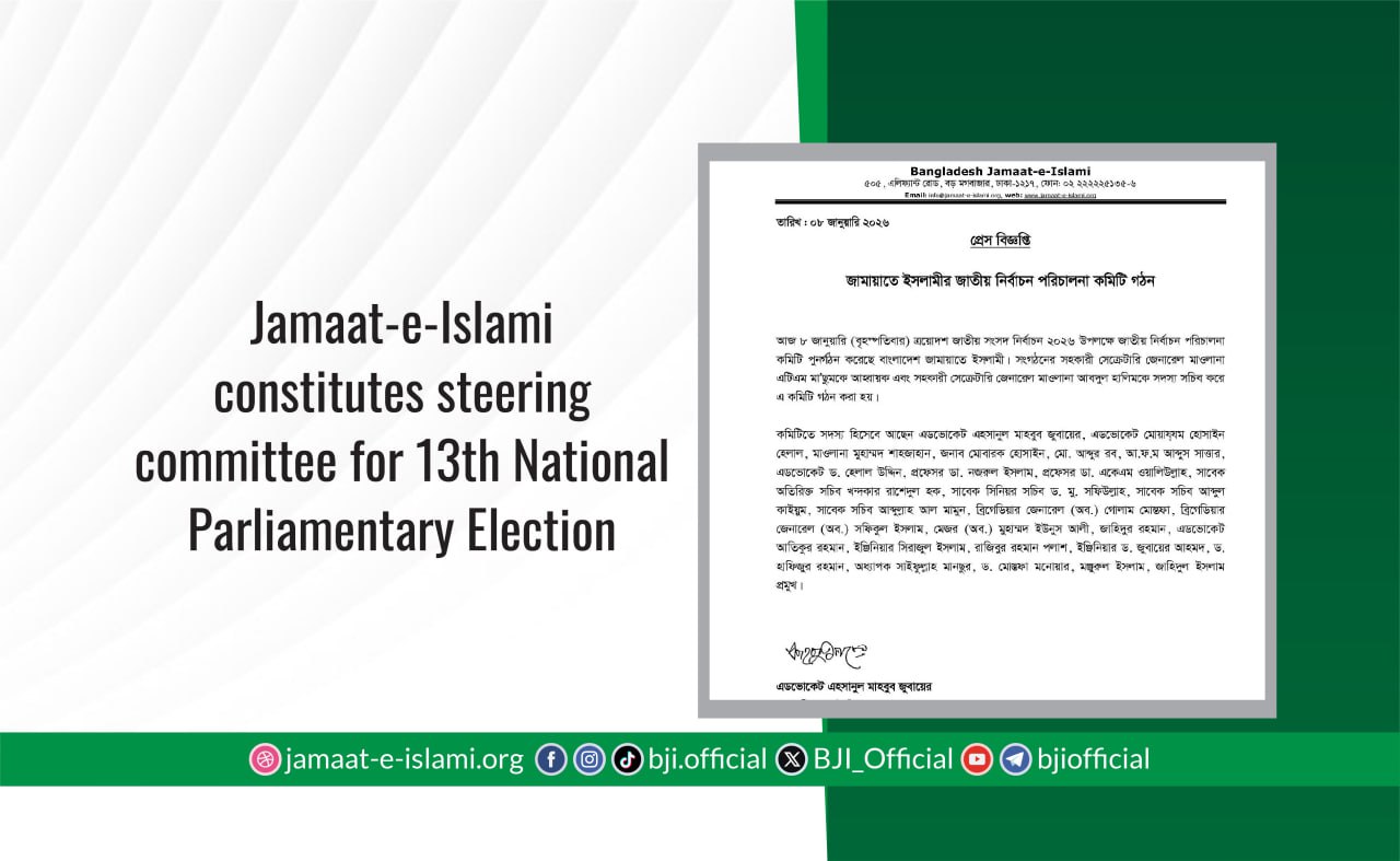On Thursday, 8 January, Bangladesh Jamaat-e-Islami reconstituted its National Election Steering Committee in preparation for the 13th National Parliamentary Election 2026. The committee has been formed with Assistant Secretary General Maulana ATM Masum as the Convener and Assistant Secretary General Maulana Abdul Halim as the Member Secretary.