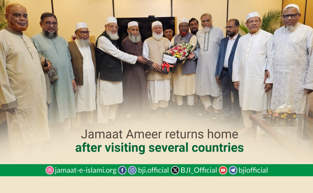 Bangladesh Jamaat-e-Islami’s Ameer Dr. Shafiqur Rahman, has returned to Dhaka today, November 4, after performing the holy Umrah in Saudi Arabia and visiting the United States, the United Kingdom, and Turkey. At 5:30 a.m. on Tuesday, leaders and activists welcomed Jamaat Ameer Dr. Shafiqur Rahman with flowers at the VIP lounge of Hazrat Shahjalal International Airport.