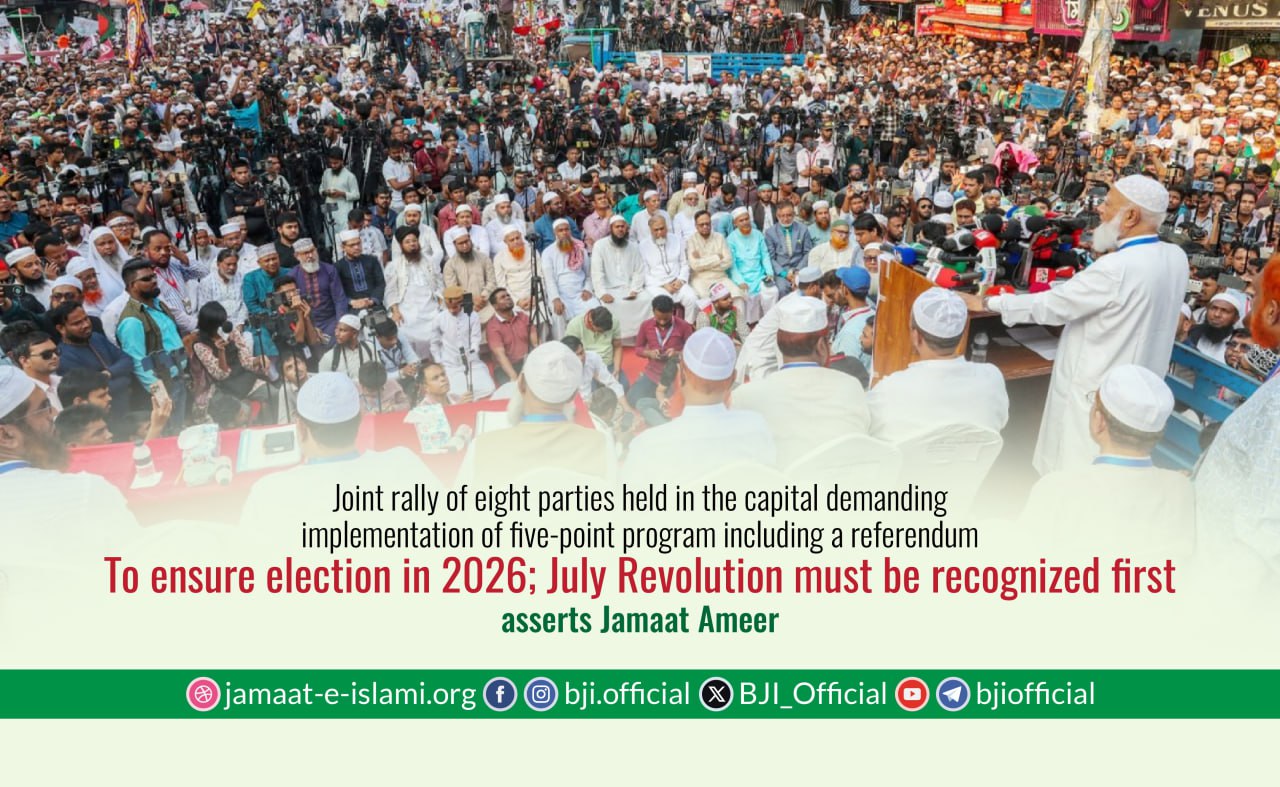 Bangladesh Jamaat-e-Islami’s Secretary General and former MP Mia Golam Porwar said today’s rally sends a message of unity to the Muslim Community of Bangladesh. He said that by maintaining this unity the five-point demands of the mass of the people will be obtained. He said all of Bangladesh’s constitutional experts agree that there is no legal obstacle to holding a referendum before the national election. If a referendum can be held on the day of the national election, why is it not possible in November or before the national election day? Leaving that question, he said that without implementation of the July Charter, how could the 13th national election be possible before the nation — that must be made clear. He appealed to the interim government saying that without implementation of the July Charter it will in no way be constitutionally appropriate to hold a national election in February 2026.