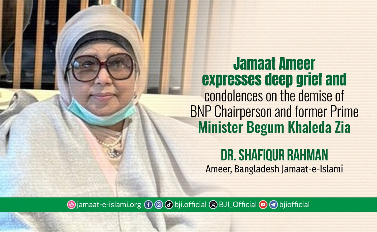 Bangladesh Jamaat-e-Islami's Ameer Dr. Shafiqur Rahman today, 30 December, issued a message of condolence expressing deep grief and condolences on the passing of former Prime Minister and BNP Chairperson Begum Khaleda Zia.