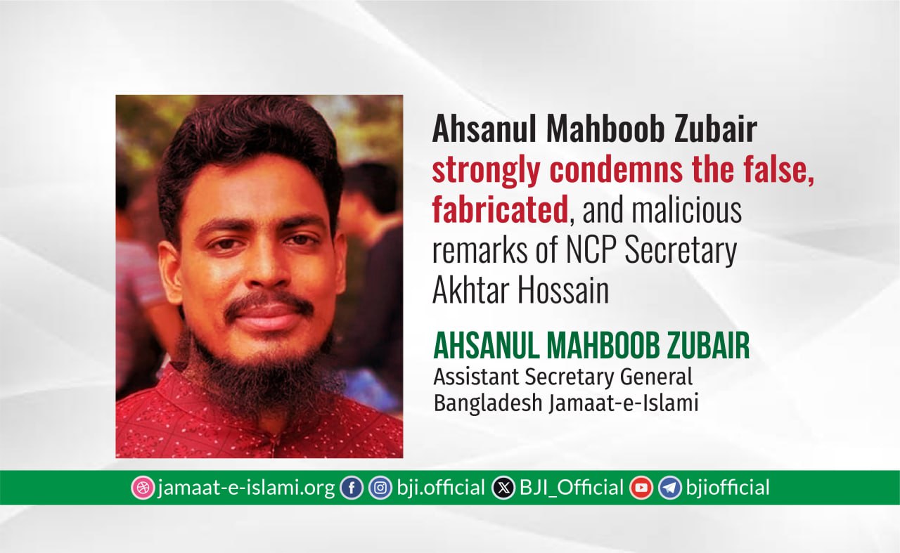 Assistant Secretary General of Bangladesh Jamaat-e-Islami and Head of its Central Publicity and Media Department Advocate Ahsanul Mahboob Zubair issued a statement today, 7 December expressing strong condemnation and protest against the false, fabricated, and politically motivated statement made by Member Secretary of the National Citizens Party (NCP), Akhtar Hossain, against Bangladesh Jamaat-e-Islami,