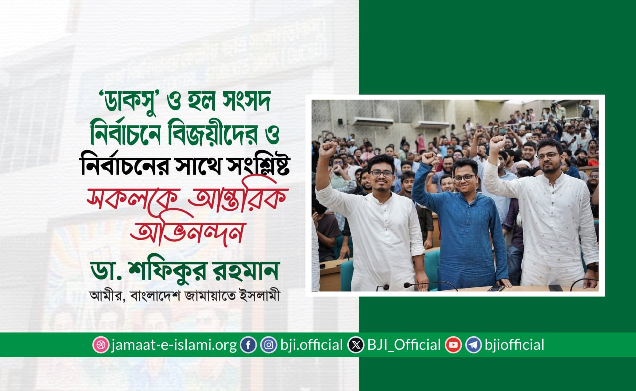 ঢাকা বিশ্ববিদ্যালয় কেন্দ্রীয় ছাত্র সংসদ ‘ডাকসু’ ও হল সংসদ নির্বাচনে বিজয়ীদের ও নির্বাচনের সাথে সংশ্লিষ্ট সকলকে আন্তরিক অভিনন্দন জানিয়ে বাংলাদেশ জামায়াতে ইসলামীর আমীর ডা. শফিকুর রহমান ১০ সেপ্টেম্বর এক বিবৃতি প্রদান করেছেন।