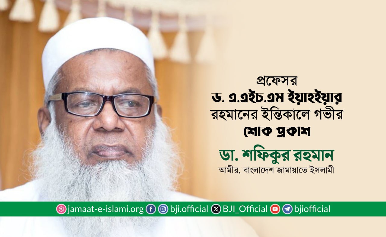 ইসলামী বিশ্ববিদ্যালয়, কুষ্টিয়ার থিওলজি অ্যান্ড ইসলামিক স্টাডিজ অনুষদের সাবেক ডিন এবং আল কুরআন এন্ড ইসলামিক স্টাডিজ বিভাগের প্রাক্তন চেয়ারম্যান প্রফেসর ড. এ.এইচ.এম ইয়াহইয়ার রহমানের ইন্তিকালে গভীর শোক প্রকাশ করে বাংলাদেশ জামায়াতে ইসলামীর আমীর ডা. শফিকুর রহমান ৫ নভেম্বর এক শোকবাণী প্রদান করেছেন।