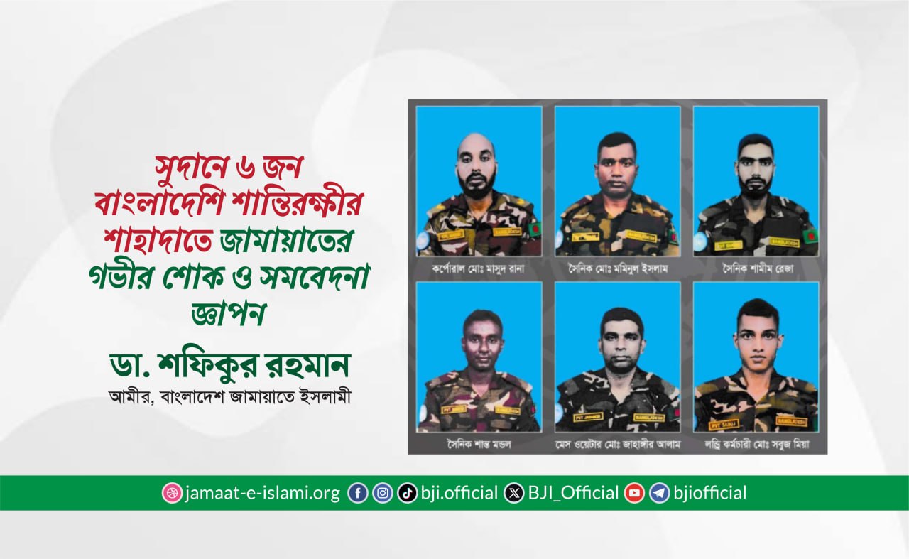 সুদানের আবেই এলাকায় অবস্থিত জাতিসঙ্ঘের একটি ঘাঁটিতে সন্ত্রাসী হামলায় বাংলাদেশ সেনাবাহিনীর ৬ জন শান্তিরক্ষী সদস্য শাহাদাত বরণের ঘটনায় গভীর শোক ও দুঃখ প্রকাশ করে এবং নিহতদের পরিবারের সদস্যদের প্রতি সমবেদনা জানিয়ে বাংলাদেশ জামায়াতে ইসলামীর আমীর ডা. শফিকুর রহমান আজ ১৪ ডিসেম্বর এক বিবৃতি প্রদান করেছেন।