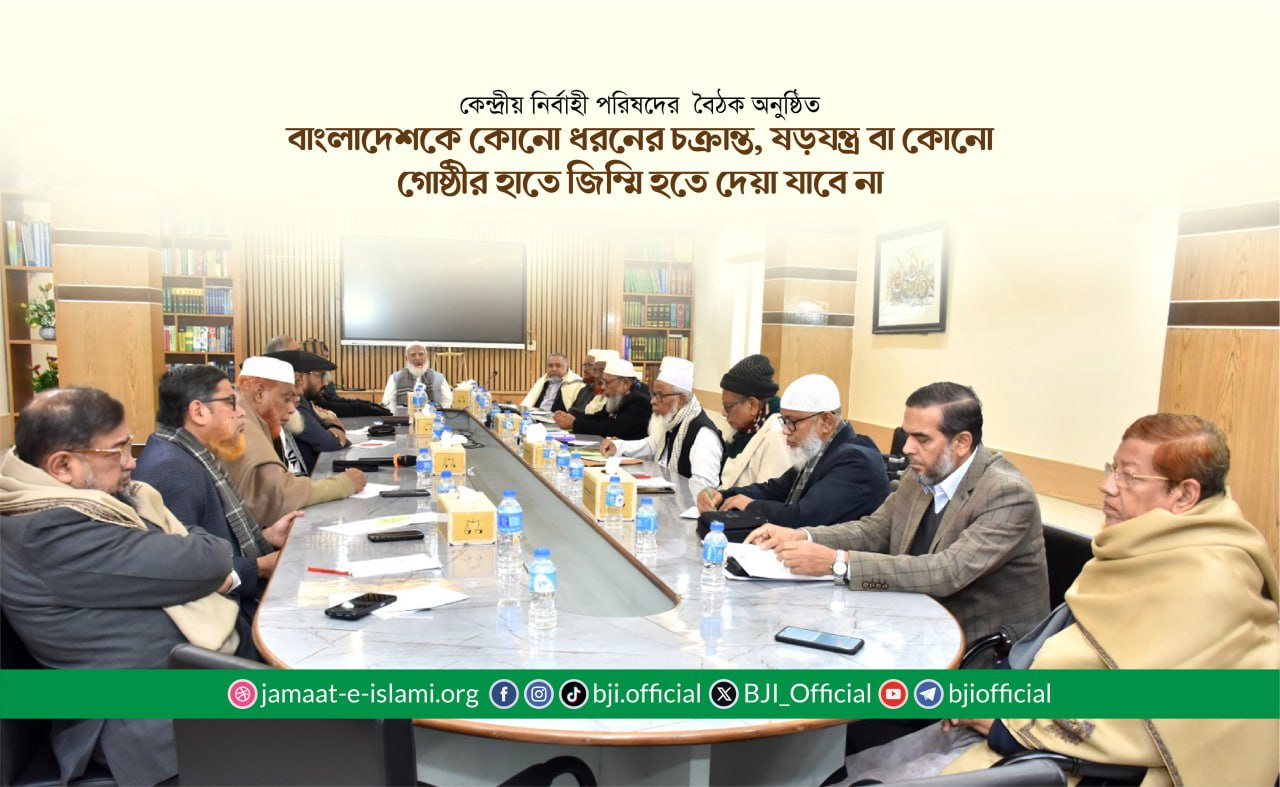 বাংলাদেশ জামায়াতে ইসলামীর কেন্দ্রীয় নির্বাহী পরিষদের এক বৈঠক আজ ৫ জানুয়ারি সোমবার সকাল ১০টায় অনুষ্ঠিত হয়। সম্মনিত আমীরে জামায়াত ডা. শফিকুর রহমানের সভাপতিত্বে সংগঠনের মগবাজারস্থ কেন্দ্রীয় কার্যালয়ে বৈঠকটি অনুষ্ঠিত হয়। বৈঠকে সংগঠনের নায়েবে আমীরগণ, সেক্রেটারি জেনারেল এবং সহকারী সেক্রেটারি জেনারেলগণসহ কেন্দ্রীয় নির্বাহী পরিষদের সদস্যবৃন্দ উপস্থিত ছিলেন।