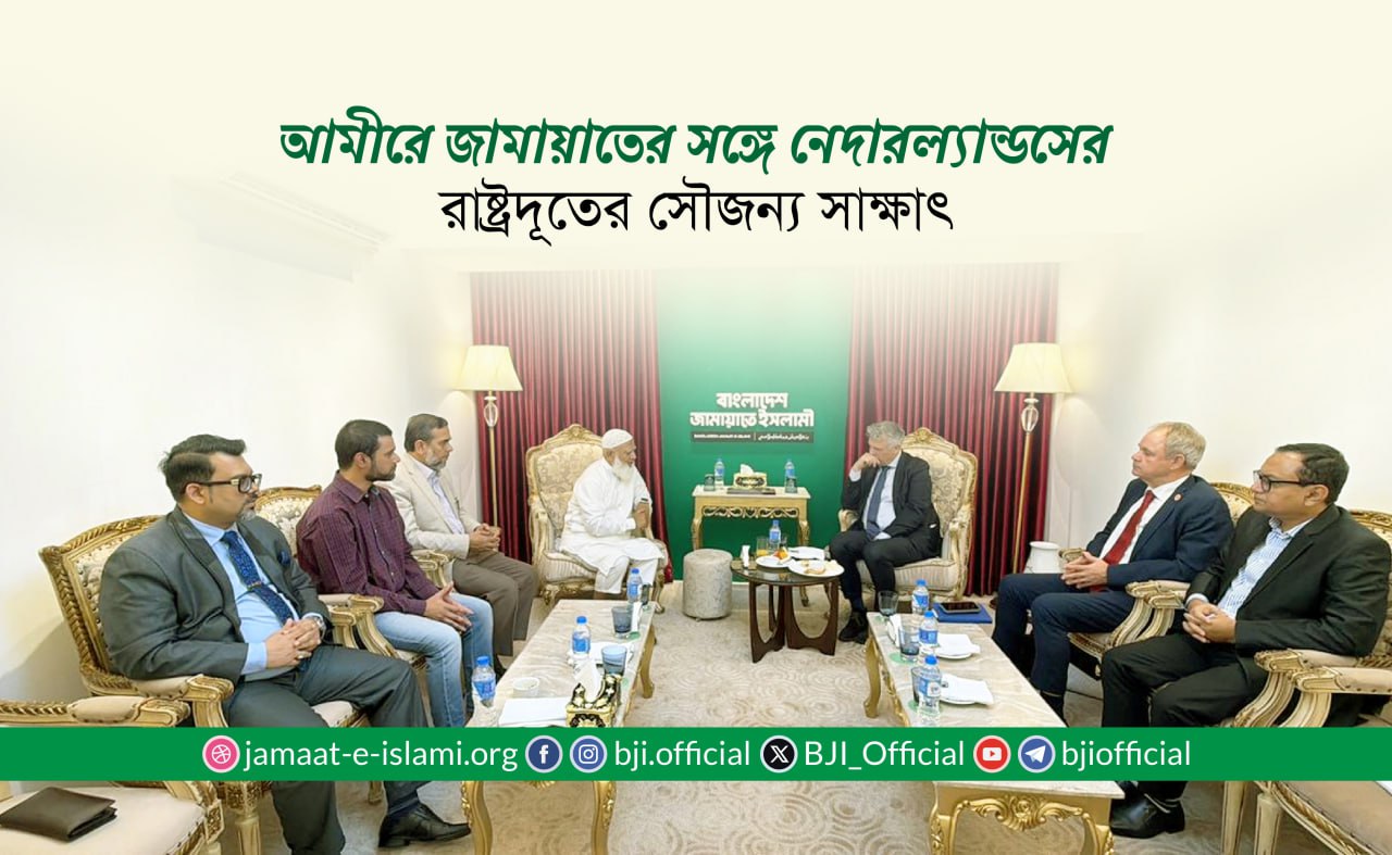 ১৯ নভেম্বর (বুধবার) বিকালে বাংলাদেশ জামায়াতে ইসলামীর আমীর ডা. শফিকুর রহমানের সঙ্গে ঢাকাস্থ নেদারল্যাণ্ডস দূতাবাসের নতুন রাষ্ট্রদূত মান্যবর জোরিস ভ্যান বোমেল এক বৈঠকে মিলিত হন। বৈঠকটি আমীরে জামায়াতের বসুন্ধরার কার্যালয়ে অত্যন্তু আন্তরিকতা ও সৌহার্দ্যপূর্ণ পরিবেশে অনুষ্ঠিত হয়। এ সময় তাঁর সঙ্গে ছিলেন দূতাবাসের ফার্স্ট সেক্রেটারি (পলিটিক্যাল অ্যাফেয়ার্স) মি. কোর স্টাউটেন এবং সিনিয়ির পলিটিক্যাল এডভাইজার মি. লুবাইন মাসুম।
