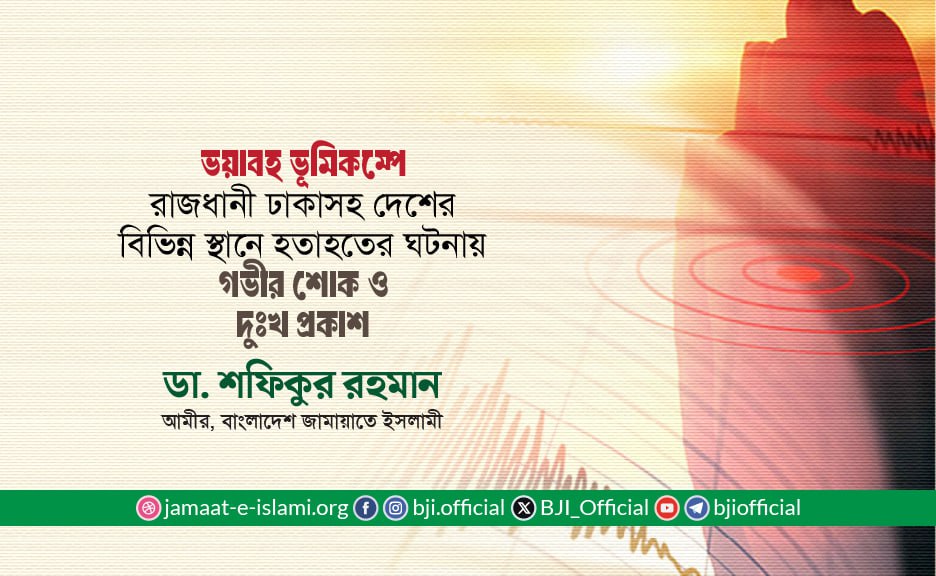 ভয়াবহ ভূমিকম্পে রাজধানী ঢাকাসহ দেশের বিভিন্ন স্থানে হতাহতের ঘটনায় গভীর শোক ও দুঃখ প্রকাশ করে বাংলাদেশ জামায়াতে ইসলামীর আমীর ডা. শফিকুর রহমান আজ ২১ নভেম্বর এক বিবৃতি প্রদান করেছেন।