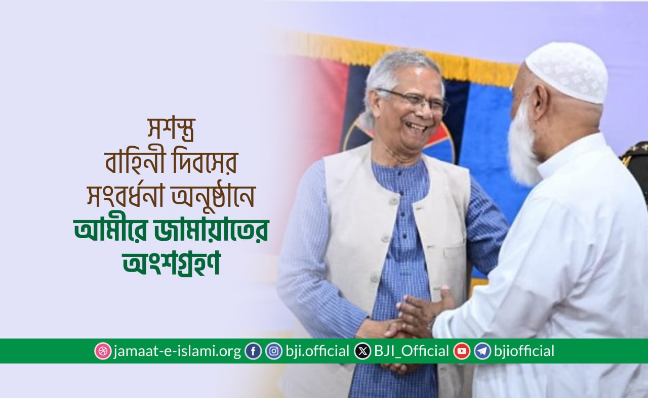 আজ ২১ নভেম্বর (জুম’আ বার) বিকেল ৩টায় অন্তর্বর্তীকালীন সরকারের প্রধান উপদেষ্টা প্রফেসর ড. মুহাম্মাদ ইউনূস এর পক্ষ থেকে ঢাকা সেনানিবাসের সেনাকুঞ্জে সশস্ত্র বাহিনী দিবস উপলক্ষে সংবর্ধনা অনুষ্ঠানের আয়োজন করা হয়। বাংলাদেশ জামায়াতে ইসলামীর আমীর ডা. শফিকুর রহমানের নেতৃত্বে পাঁচ সদস্যের একটি প্রতিনিধি দল অনুষ্ঠানে যোগ দেন।