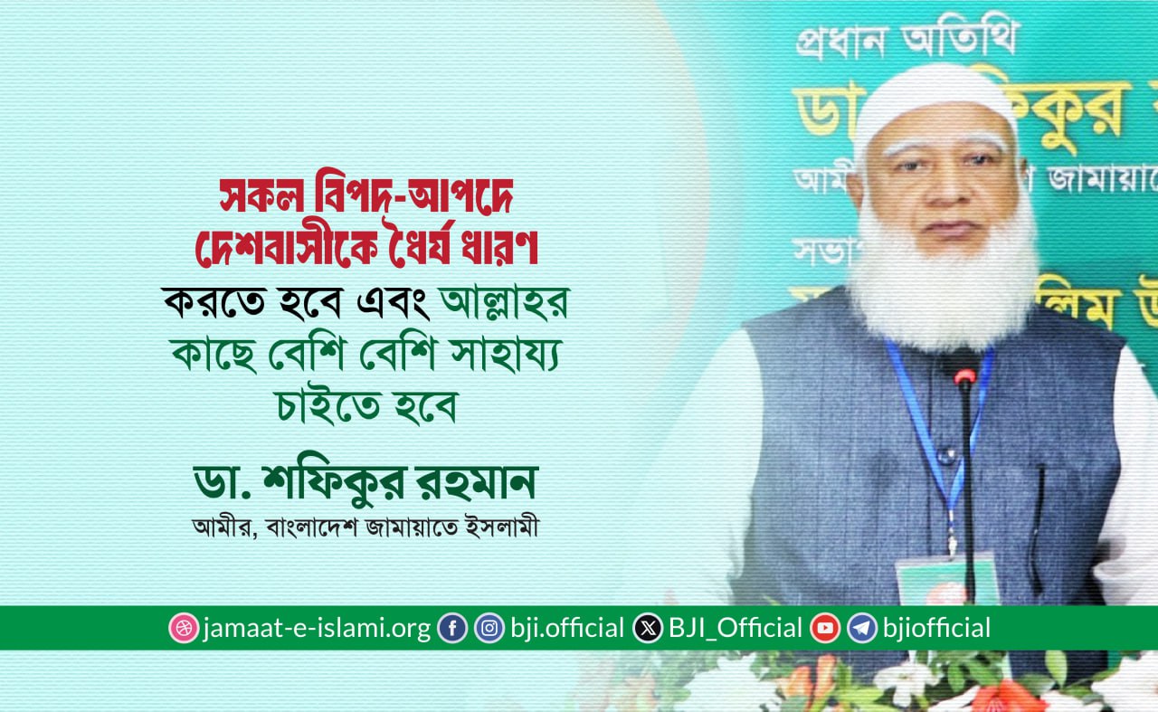 গতকাল ২১ নভেম্বর ভূমিকম্পের পরে আবার আজ ২২ নভেম্বর ঢাকা মহানগরী ও আশুলিয়া এলাকায় মৃদু ভূমিকম্প অনুভূত হওয়ায় গভীর উদ্বেগ প্রকাশ এবং দেশের জনগণের প্রতি ধৈর্য ধারণ ও আল্লাহ তাআলার উপর তাওয়াক্কুল করার আহ্বান জানিয়ে বাংলাদেশ জামায়াতে ইসলামী আমীর ডা. শফিকুর রহমান আজ ২২ নভেম্বর প্রদত্ত এক বিবৃতিতে বলেন, “সকল বিপদ-আপদে দেশবাসীর সবাইকে ধৈর্য ধারণ করতে হবে।