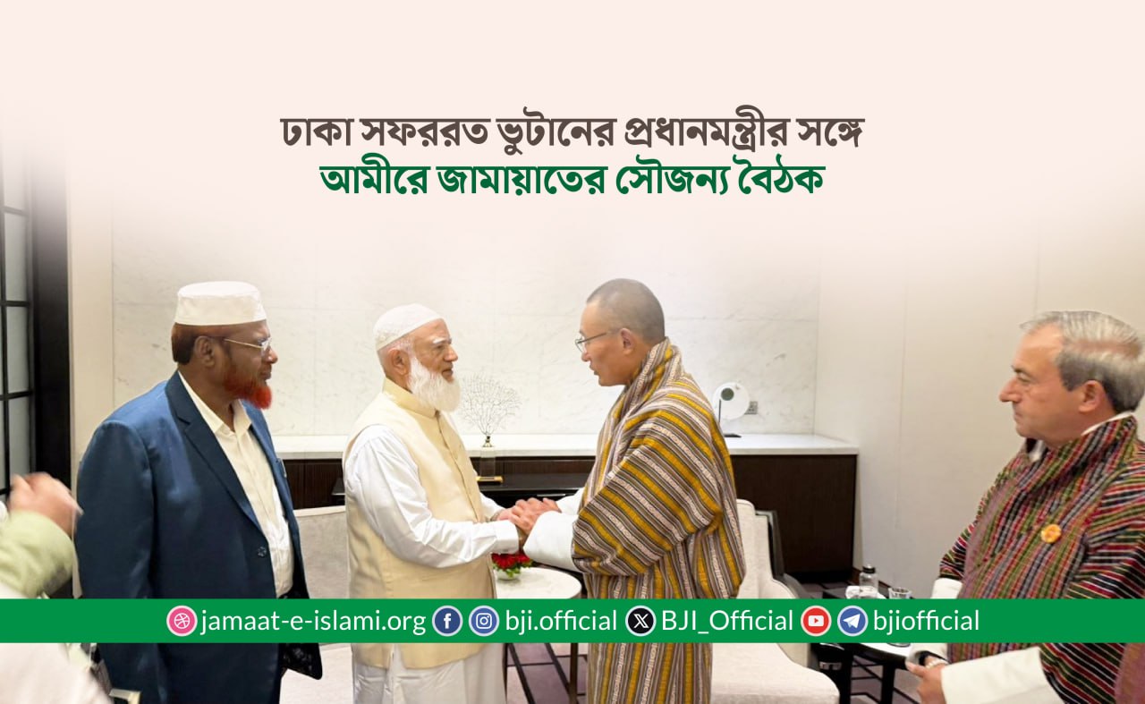 রোববার (২৩ নভেম্বর) সন্ধ্যায় রাজধানীর শাহবাগের হোটেল ইন্টারকন্টিনেন্টালে ঢাকা সফররত ভুটানের মান্যবর প্রধানমন্ত্রী মি. শেরিং টোবগের সঙ্গে বাংলাদেশ জামায়াতে ইসলামীর আমীর ডা. শফিকুর রহমানের এক বৈঠক অনুষ্ঠিত হয়।