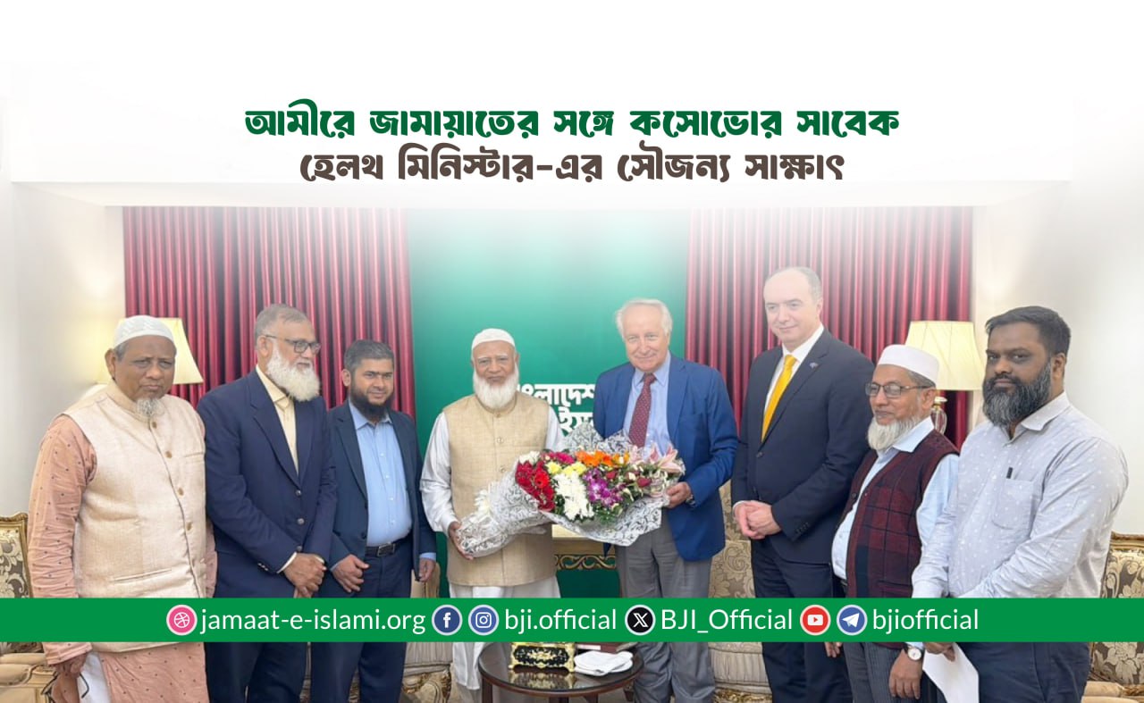 ২৫ নভেম্বর (মঙ্গলবার) বিকাল ৪:১৫ টায় বাংলাদেশ জামায়াতে ইসলামীর সম্মানিত আমীর ডা. শফিকুর রহমান এর সঙ্গে রাজধানীর বসুন্ধরাস্থ কার্যালয়ে ঢাকা সফররত রিপাবলিক অব কসোভোর সাবেক হেলথ মিনিস্টার প্রফেসর ডা. রিফাত লতিফি এক সৌজন্য সাক্ষাতে মিলিত হন। এ সময় বাংলাদেশে নিযুক্ত রিপাবলিক অব কসোভোর মান্যবর রাষ্ট্রদূত মি. লুলজিম প্লানা উপস্থিত ছিলেন।