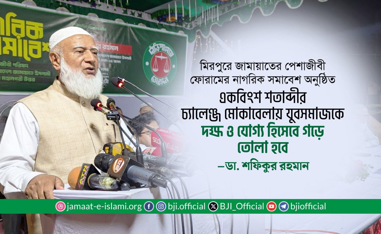 তিনি গতকাল ২৫ নভেম্বর রাত ৮.০০ টায় মিরপুরের রূপসী প্রো-অ্যাকটিভ ভিলেজ প্রাঙ্গণে ঢাকা মহানগরী উত্তর জামায়াতের পেশাজীবী পরিষদ আয়োজিত এক নাগরিক সমাবেশে প্রধান অতিথির বক্তব্যে এসব কথা বলেন।