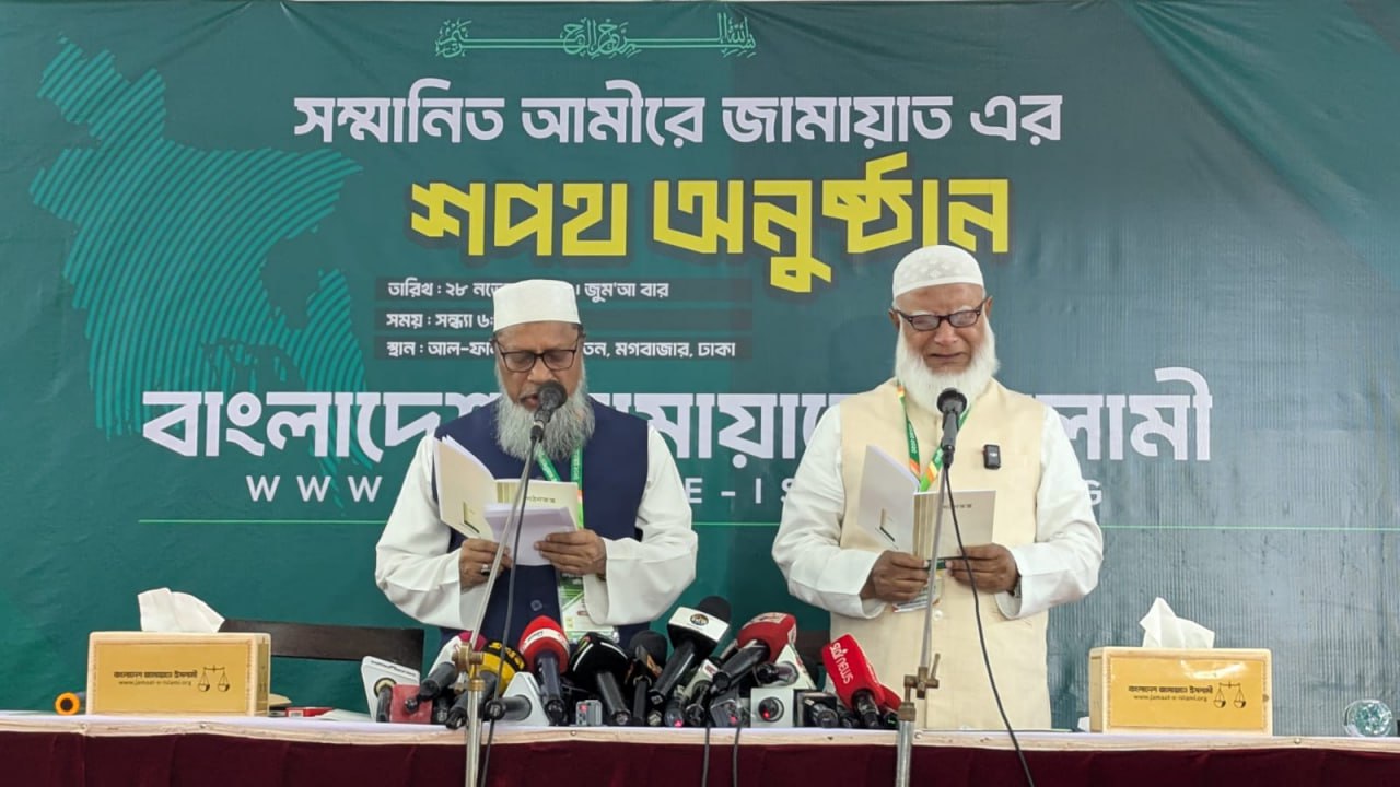 বাংলাদেশ জামায়াতে ইসলামীর আমীর ডা. শফিকুর রহমান আজ ২৮ নভেম্বর সন্ধ্যা ৬.৩০টায় আগামী ২০২৬-২০২৮ সাল পর্যন্ত কার্যকাল মেয়াদের জন্য বাংলাদেশ জামায়াতে ইসলামীর আমীর হিসেবে শপথ গ্রহণ করেছেন। শপথ গ্রহণ অনুষ্ঠান পরিচালনা করেন বাংলাদেশ জামায়াতে ইসলামীর আভ্যন্তরীণ প্রধান নির্বাচন কমিশনার মাওলানা এটিএম মা’ছুম। অর্থসহ পবিত্র কুরআন তিলাওয়াতের মাধ্যমে শপথগ্রহণ অনুষ্ঠান শুরু করা হয়। অর্থসহ পবিত্র কুরআন তিলাওয়াত করেন বাংলাদেশ জামায়াতে ইসলামীর বান্দরবান জেলার আমীর মাওলানা আব্দুস সালাম আযাদ।