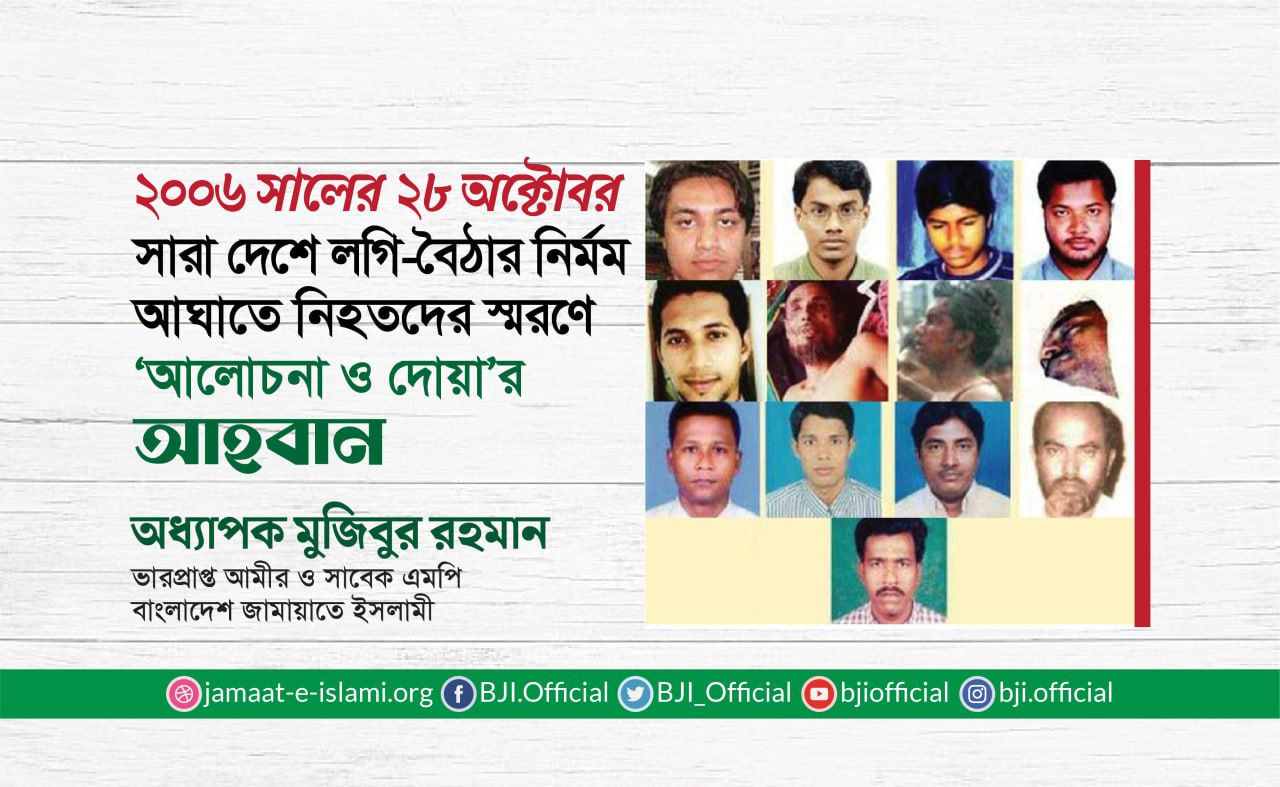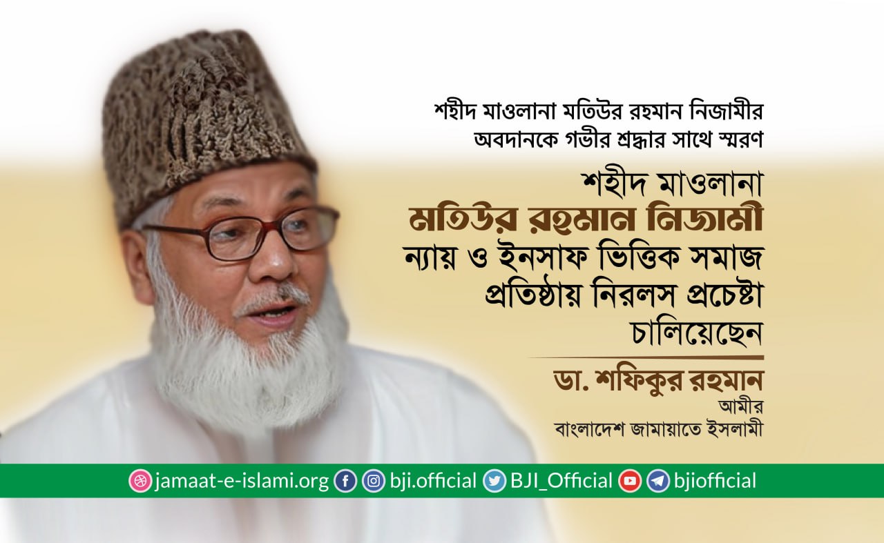 বাংলাদেশ জামায়াতে ইসলামীর সাবেক আমীর, আন্তর্জাতিক খ্যাতিসম্পন্ন আলেমে দ্বীন এবং সাবেক মন্ত্রী ও সাবেক জাতীয় সংসদ সদস্য শহীদ মাওলানা মতিউর রহমান নিজামীর অবদানকে গভীর শ্রদ্ধার সাথে স্মরণ করে বাংলাদেশ জামায়াতে ইসলামীর আমীর ডা: শফিকুর রহমান আজ ৯ মে প্রদত্ত এক বিবৃতিতে বলেন,