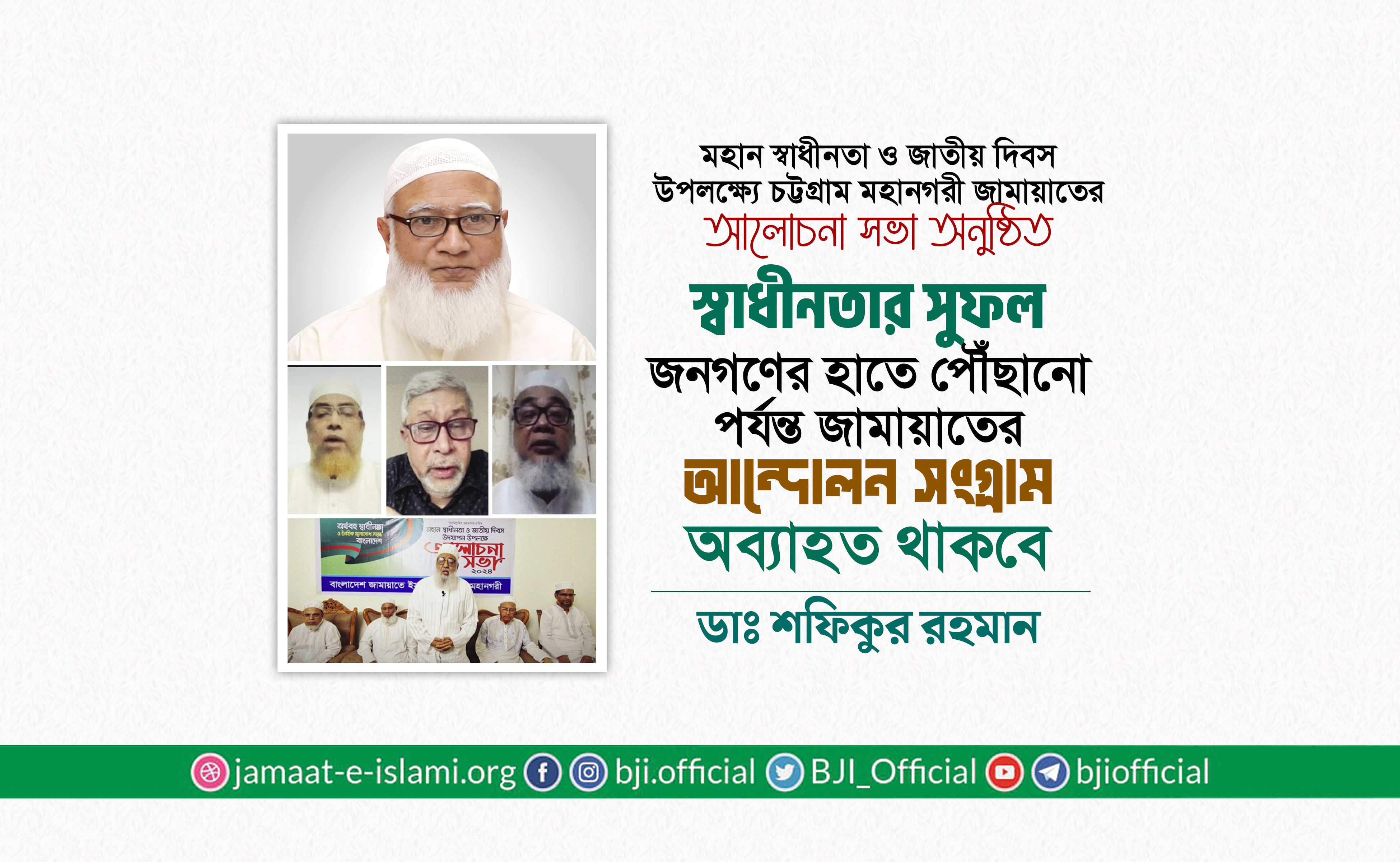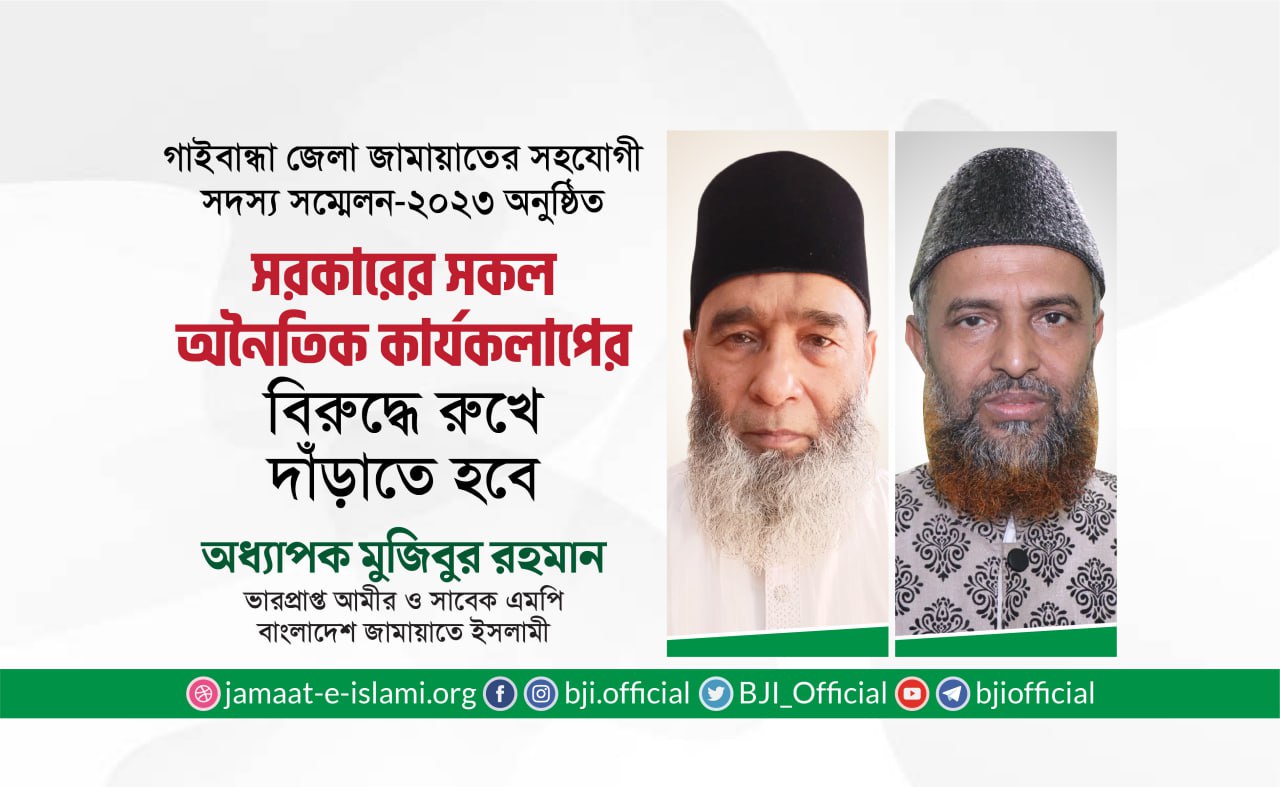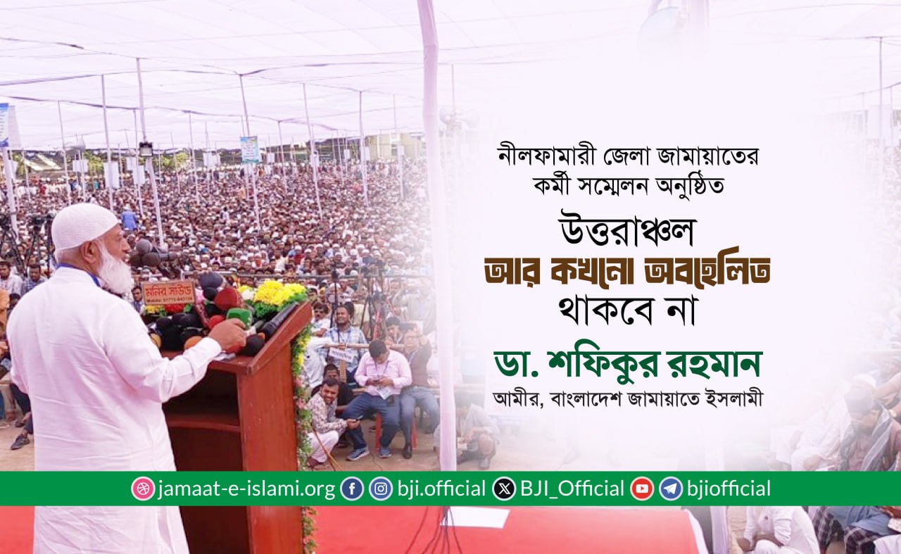 জামায়াতে ইসলামী দেশে ন্যায়-ইনসাফের সমাজ প্রতিষ্ঠার জন্য দীর্ঘ দিন ধরে আন্দোলন- সংগ্রাম চালিয়ে যাচ্ছে; আর এ আন্দোলনের চূড়ান্ত বিজয় না হওয়া পর্যন্ত সংগ্রাম অব্যাহত রাখার দৃঢ় প্রত্যয় ব্যক্ত করেছেন বাংলাদেশ জামায়াতে ইসলামীর আমীর ডা. শফিকুর রহমান।