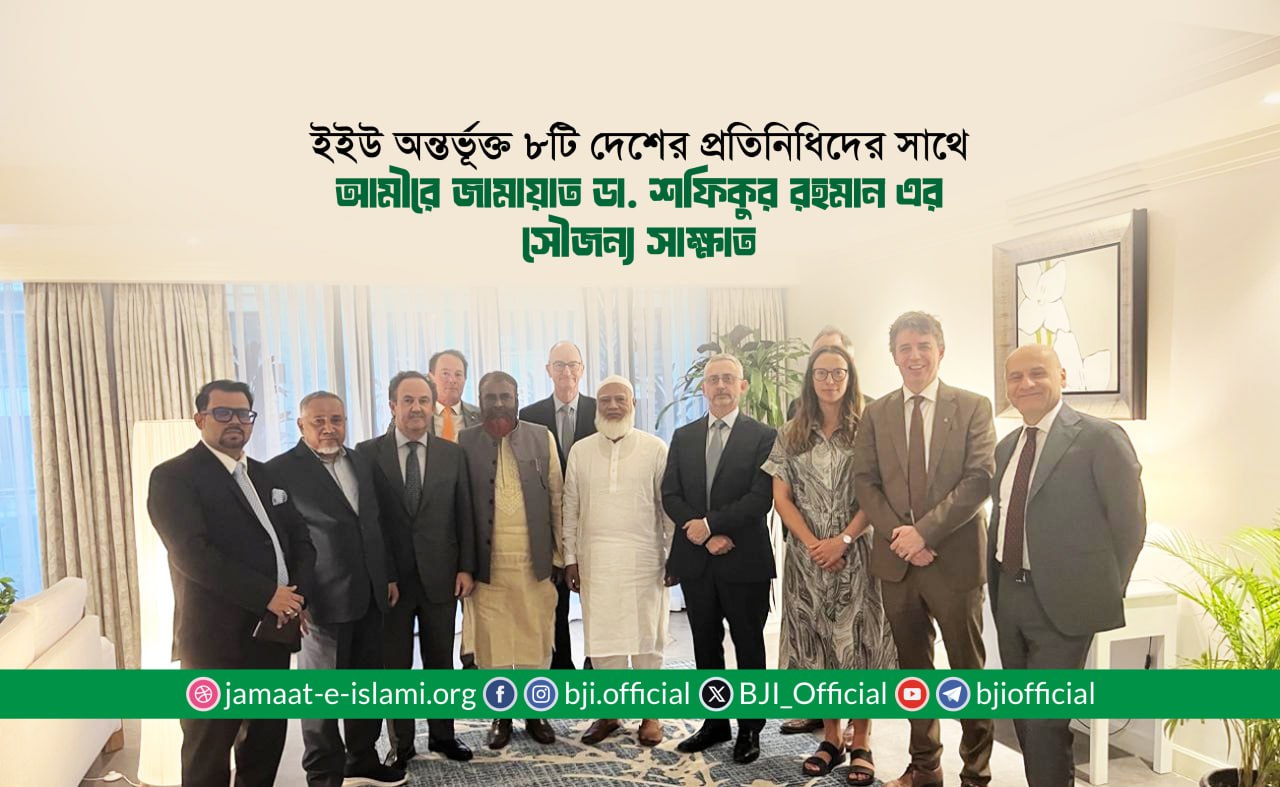 আজ ১৬ সেপ্টেম্বর (মঙ্গলবার) বিকাল ৪টায় বাংলাদেশ জামায়াতে ইসলামীর ৪ সদস্যবিশিষ্ট একটি প্রতিনিধি দল আমীরে জামায়াত ডা. শফিকুর রহমানের নেতৃত্বে ইউরোপীয় পার্লামেন্টের উচ্চ পর্যায়ের একটি প্রতিনিধি দলের সঙ্গে ঢাকাস্থ ইউরোপীয় ইউনিয়নের দূতাবাসে এক গুরুত্বপূর্ণ বৈঠকে মিলিত হন। আমীরে জামায়াতের সঙ্গে ছিলেন নায়েবে আমীর, সাবেক এমপি ডা. সৈয়দ আব্দুল্লাহ মোঃ তাহের, সেক্রেটারি জেনারেল ও সাবেক এমপি অধ্যাপক মিয়া গোলাম পরওয়ার, এবং আমীরে জামায়াতের পররাষ্ট্র বিষয়ক উপদেষ্টা অধ্যাপক ড. মাহমুদুল হাসান।