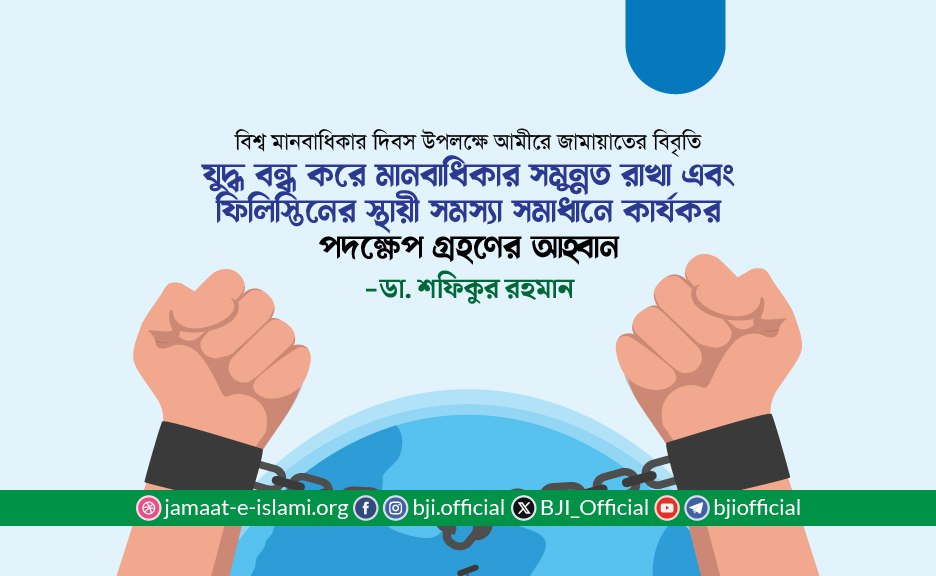 ১০ ডিসেম্বর বিশ্ব মানবাধিকার দিবস উপলক্ষ্যে বাংলাদেশ জামায়াতে ইসলামীর আমীর ডা. শফিকুর রহমান আজ ৯ ডিসেম্বর প্রদত্ত এক বিবৃতিতে বলেন, “১০ ডিসেম্বর সারা বিশ্বে ঘটা করে বিশ্ব মানবাধিকার দিবস পালন করা হলেও বাংলাদেশসহ সারা বিশ্বেই মানবাধিকার চরমভাবে লংঘিত হচ্ছে।