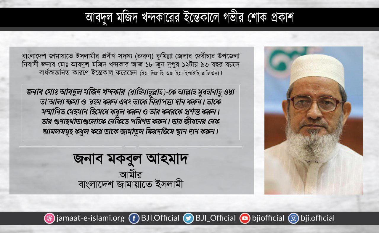 জনাব মোঃ আবদুল মজিদ খন্দকারের ইন্তেকালে গভীর শোক প্রকাশ