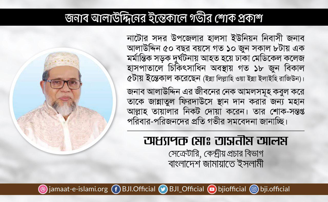 জনাব আলাউদ্দিনের ইন্তেকালে গভীর শোক প্রকাশ