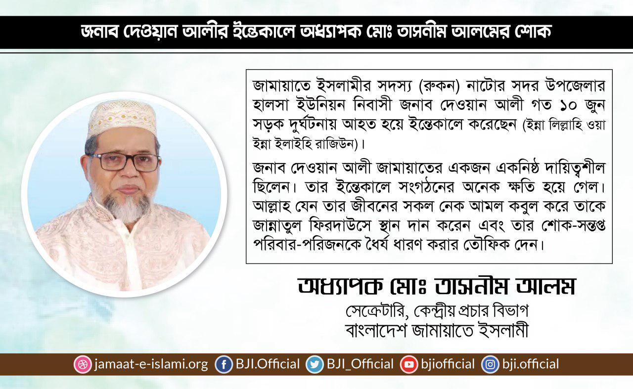 জনাব দেওয়ান আলীর ইন্তেকালে অধ্যাপক মোঃ তাসনীম আলমের শোক