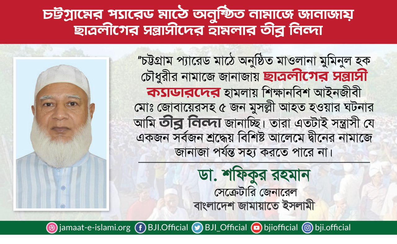 চট্টগ্রামের প্যারেড মাঠে অনুষ্ঠিত নামাজে জানাজায় ছাত্রলীগের সন্ত্রাসীদের হামলার তীব্র নিন্দা