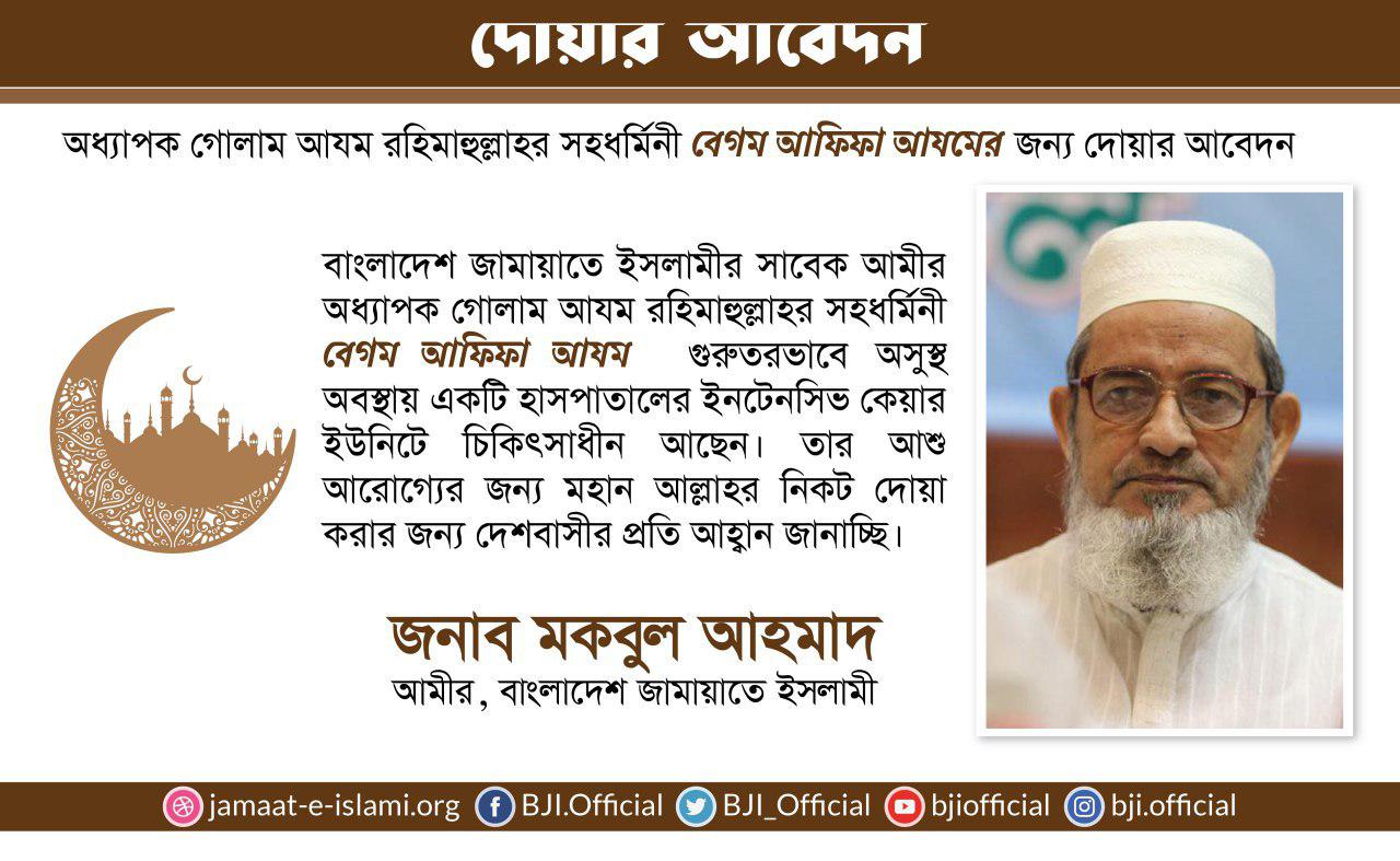 অধ্যাপক গোলাম আযম রহিমাহুল্লাহর সহধর্মিনী বেগম আফিফা আযমের জন্য দোয়ার আবেদন