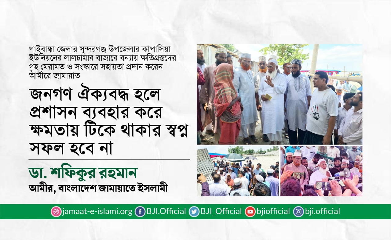 গাইবান্ধা জেলার সুন্দরগঞ্জ উপজেলার কাপাসিয়া ইউনিয়নের লালচামার বাজারে বন্যায় ক্ষতিগ্রস্তদের গৃহ মেরামত ও সংস্কারে সহায়তা প্রদান করেন আমীরে জামায়াত