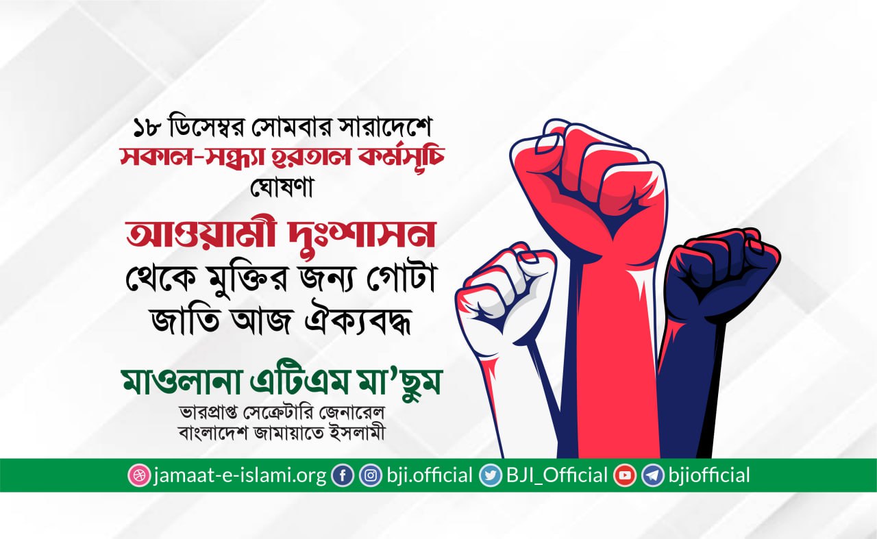 ১৮ ডিসেম্বর সোমবার সারাদেশে সকাল-সন্ধ্যা হরতাল কর্মসূচি ঘোষণা