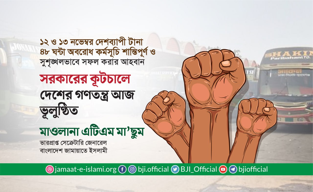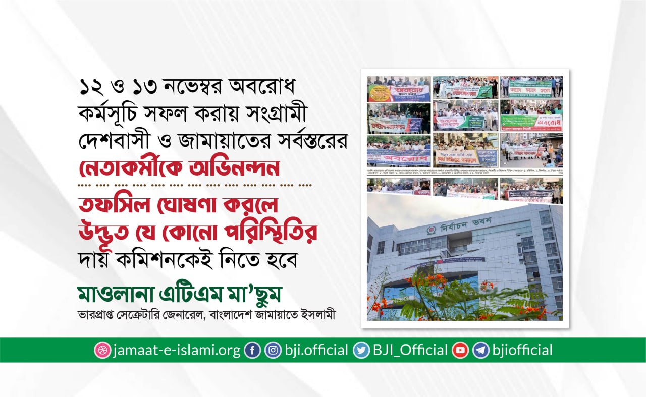 ১২ ও ১৩ নভেম্বর অবরোধ কর্মসূচি সফল করায় সংগ্রামী দেশবাসী ও জামায়াতের সর্বস্তরের নেতাকর্মীকে অভিনন্দন
