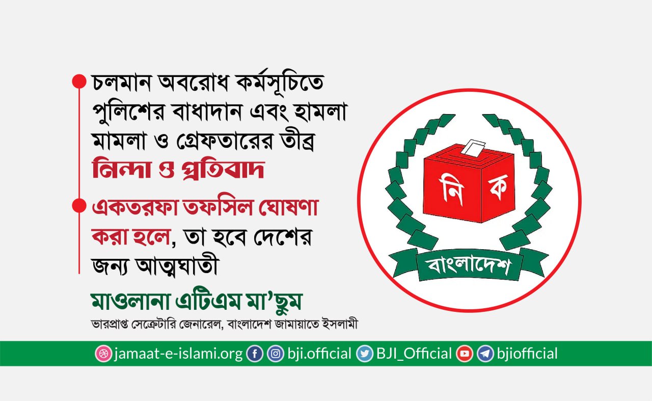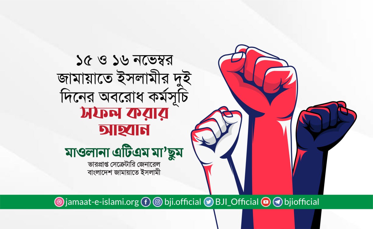 ১৯ ও ২০ নভেম্বর অবরোধ কর্মসূচি শান্তিপূর্ণভাবে সফল করায় দেশবাসী ও জামায়াতে ইসলামীর সর্বস্তরের নেতাকর্মীকে আন্তরিক অভিনন্দন