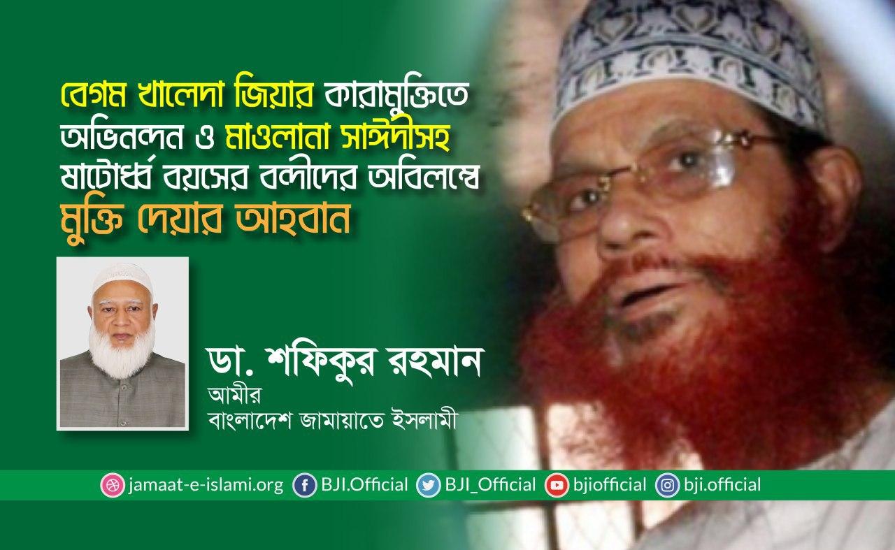 বেগম খালেদা জিয়ার কারামুক্তিতে অভিনন্দন ও মাওলানা সাঈদীসহ ষাটোর্ধ্ব বয়সের বন্দীদের অবিলম্বে মুক্তি দেয়ার আহবান