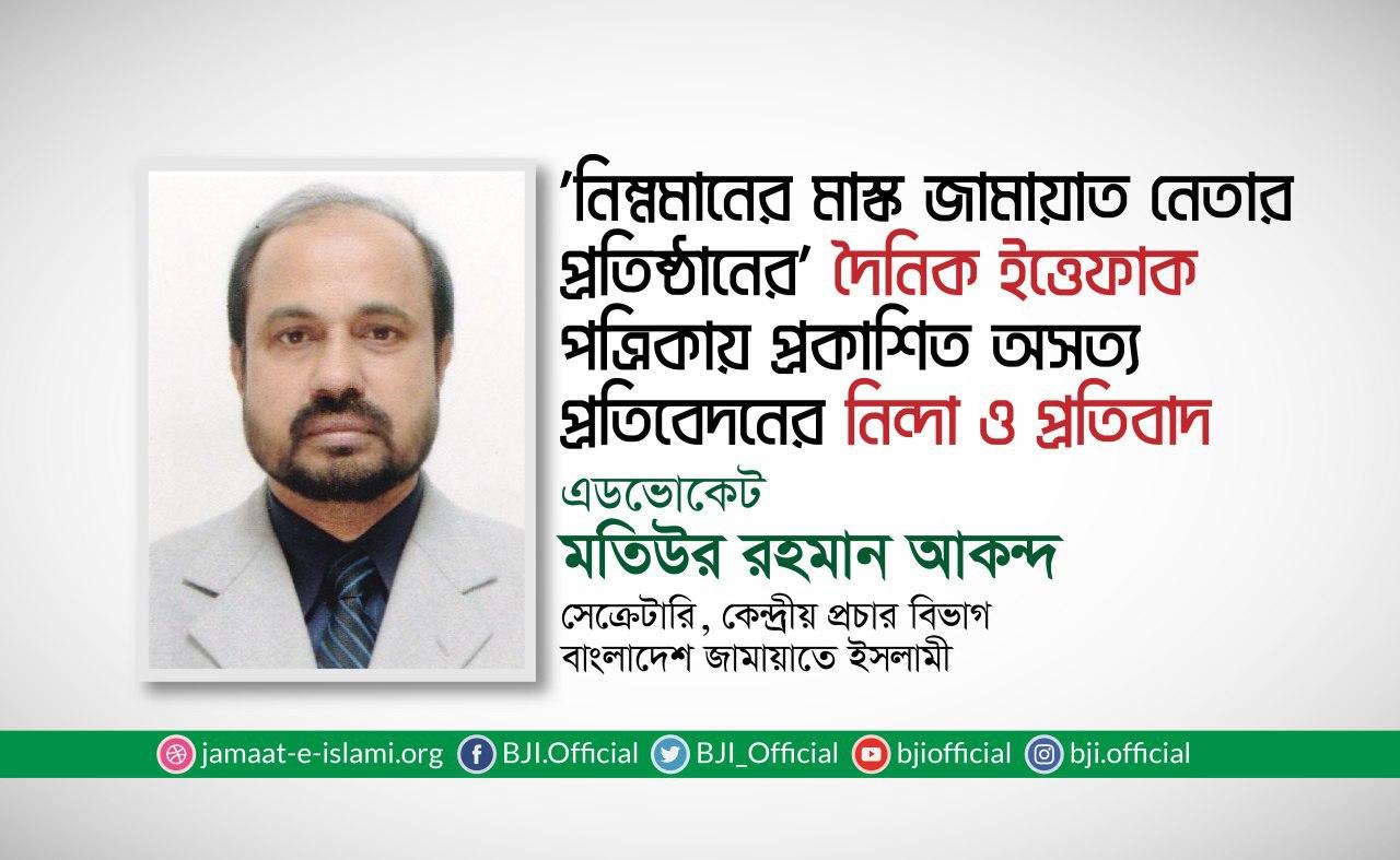 'নিম্নমানের মাস্ক জামায়াত নেতার প্রতিষ্ঠানের' দৈনিক ইত্তেফাক পত্রিকায় প্রকাশিত অসত্য প্রতিবেদনের নিন্দা ও প্রতিবাদ