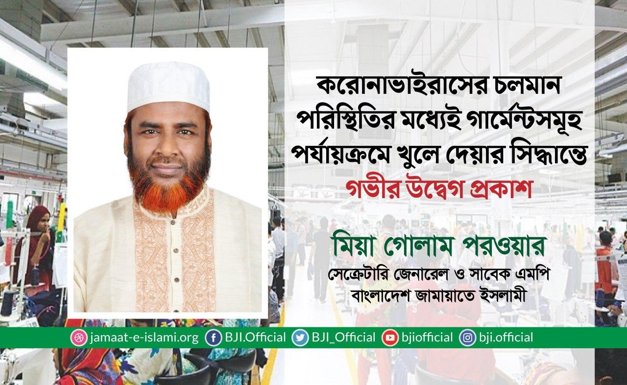 করোনাভাইরাসের চলমান পরিস্থিতির মধ্যেই গার্মেন্টসমূহ পর্যায়ক্রমে খুলে দেয়ার সিদ্ধান্তে গভীর উদ্বেগ প্রকাশ