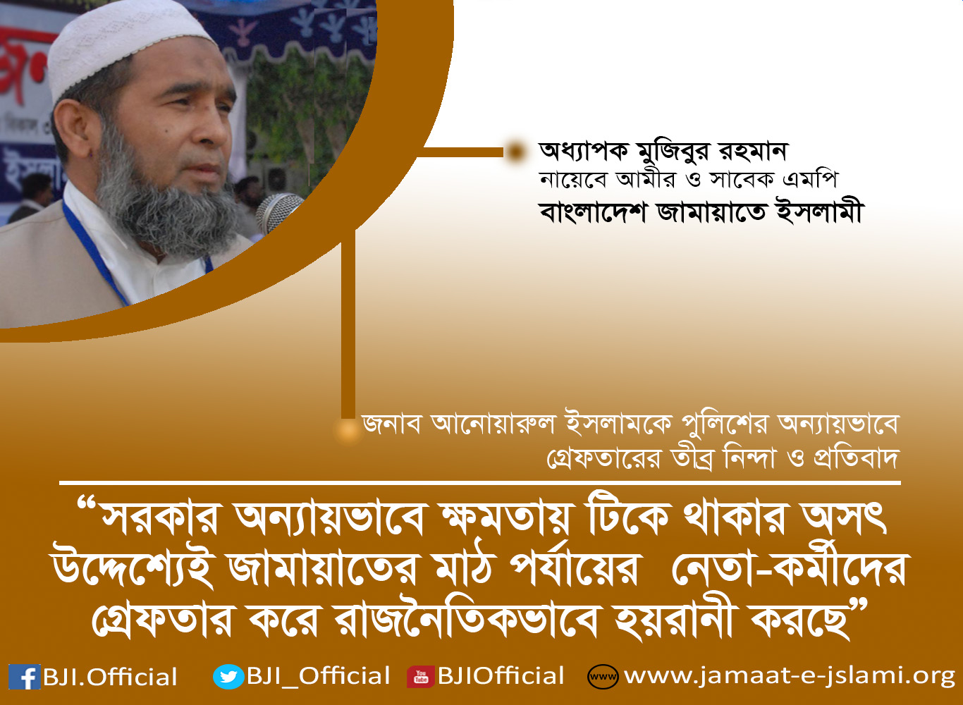 জনাব আনোয়ারুল ইসলামকে পুলিশের অন্যায়ভাবে গ্রেফতারের তীব্র নিন্দা ও প্রতিবাদ