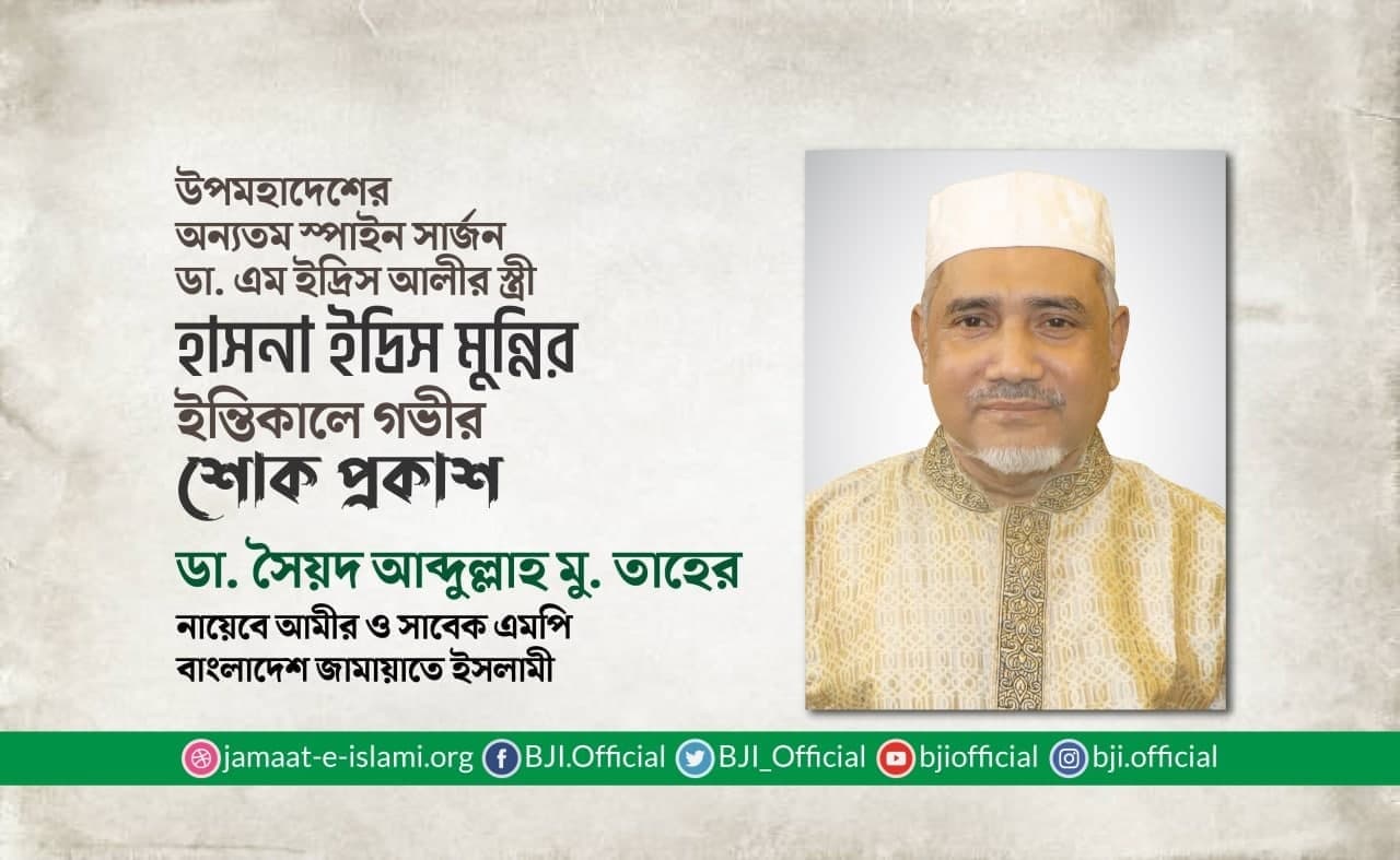 ডা. এম ইদ্রিস আলীর স্ত্রী হাসনা ইদ্রিস মুন্নির ইন্তিকালে গভীর শোক প্রকাশ