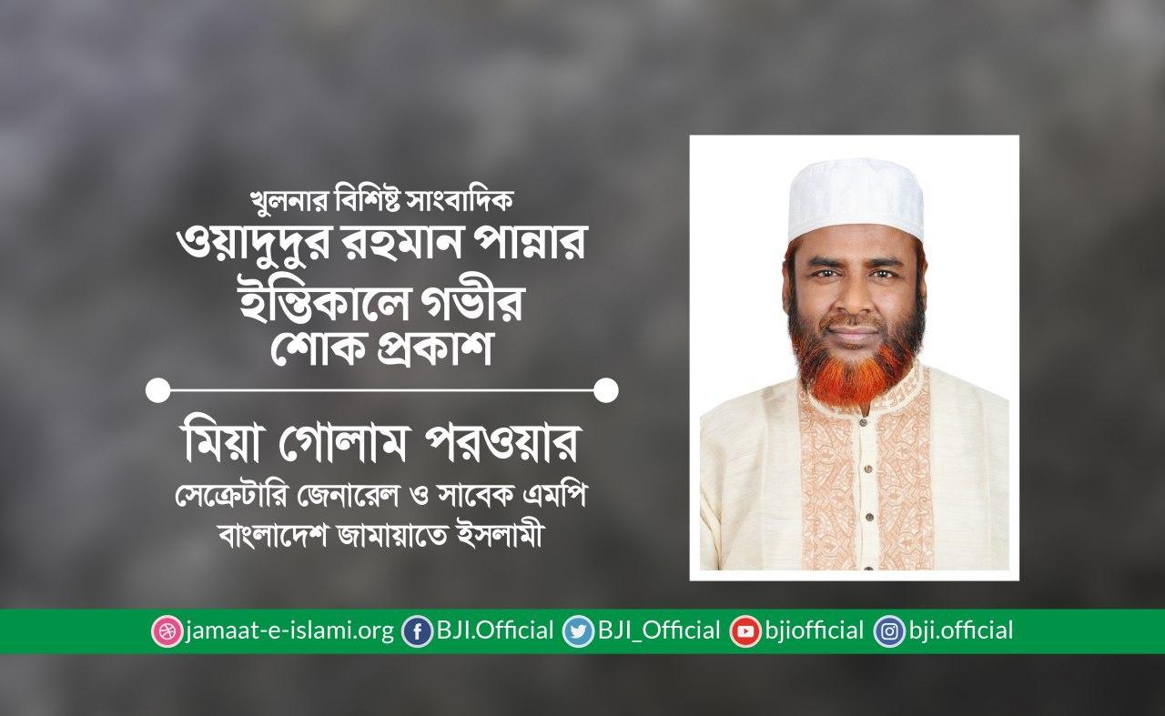 খুলনার বিশিষ্ট সাংবাদিক জনাব ওয়াদুদুর রহমান পান্নার ইন্তিকালে গভীর শোক প্রকাশ