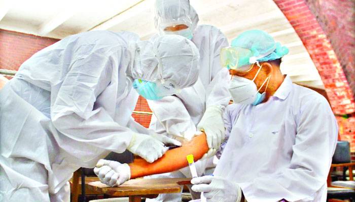 করোনা থেকে মুক্তির পর অ্যান্টিবডি পরীক্ষার জন্য সোমবার নমুনা দেন সোহরাওয়ার্দী মেডিকেল কলেজ হাসপাতালের স্বাস্থ্যকর্মীরা - কাজল হাজরা