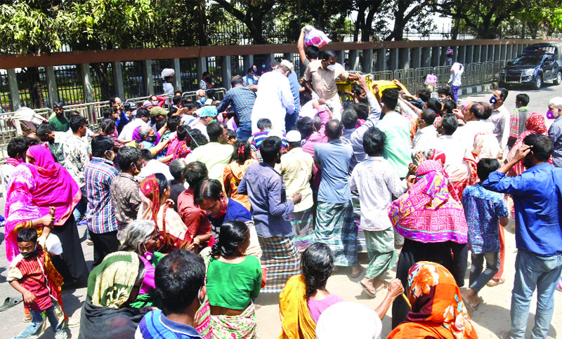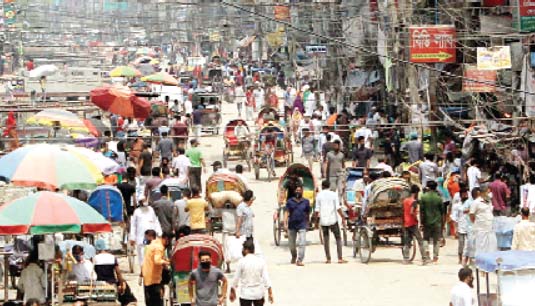 দূরত্ব বজায় না রেখে এভাবে চলাচল ঝুঁকির সৃষ্টি করতে পারে। গতকাল মঙ্গলবার রাজধানীর শনিরআখড়া এলাকা থেকে তোলা ছবি -সংগ্রাম