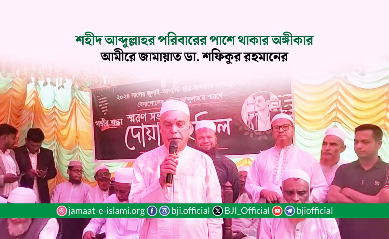 আমীরে জামায়াত ডা. শফিকুর রহমান বৈষম্যবিরোধী ছাত্র-জনতার আন্দোলনে শাহাদাত বরনকারী সকলে ন্যায় বিচার পাবেন বলে আশা প্রকাশ করেন এবং তাদের সকলের পরিবারের সাথে বাংলাদেশ জামায়াতে ইসলামী সব সময় পাশে থাকবে বলে জানান।