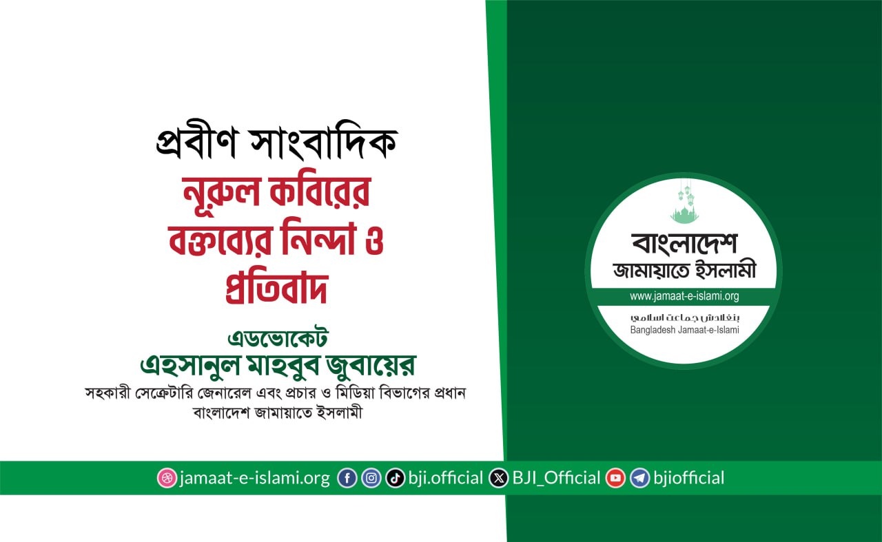 জনাব নূরুল কবির ইসলামপ্রিয় মানুষকে ‘ইসলাম রক্ষার’ নামে জামায়াতে ইসলামীর বিরুদ্ধে অবস্থান নেওয়ার আহ্বান জানিয়ে যে মন্তব্য করেছেন, আমরা মনে করি এটি গণতান্ত্রিক শিষ্টাচারের পরিপন্থি। এ ধরনের বক্তব্য সমাজে বিভাজন সৃষ্টি করে, যা কোনোভাবেই গ্রহণযোগ্য ও কাম্য নয়।