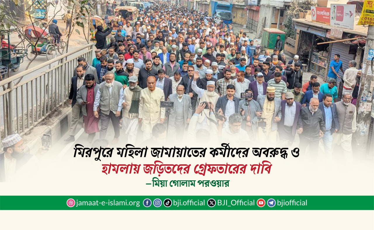 মিরপুরের পীরেরবাগে বাংলাদেশ জামায়াতে ইসলামীর মহিলা বিভাগের কর্মীদের প্রোগ্রাম চলাকালে আটকে রেখে হেনস্থা ও স্থানীয় জামায়াত ও শিবির কর্মীদের উপর হামলার ঘটনার তীব্র নিন্দা ও প্রতিবাদ জানিয়ে সংগঠনের সেক্রেটারি জেনারেল ও সাবেক এমপি মিয়া গোলাম পরওয়ার আজ ২১ জানুয়ারি বুধবার একটি বিবৃতি দিয়েছেন।