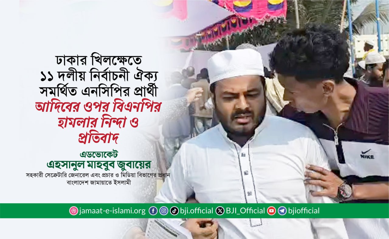 ঢাকা-১৮ আসনে এনসিপি মনোনীত প্রার্থী আরিফুল ইসলাম আদিবের ওপর হামলার ঘটনার নিন্দা ও প্রতিবাদ জানিয়ে বাংলাদেশ জামায়াতে ইসলামীর সহকারী সেক্রেটারি জেনারেল এবং কেন্দ্রীয় প্রচার ও মিডিয়া বিভাগের প্রধান এডভোকেট এহসানুল মাহবুব জুবায়ের আজ ২৬ জানুয়ারি এক বিবৃতি প্রদান করেছেন।