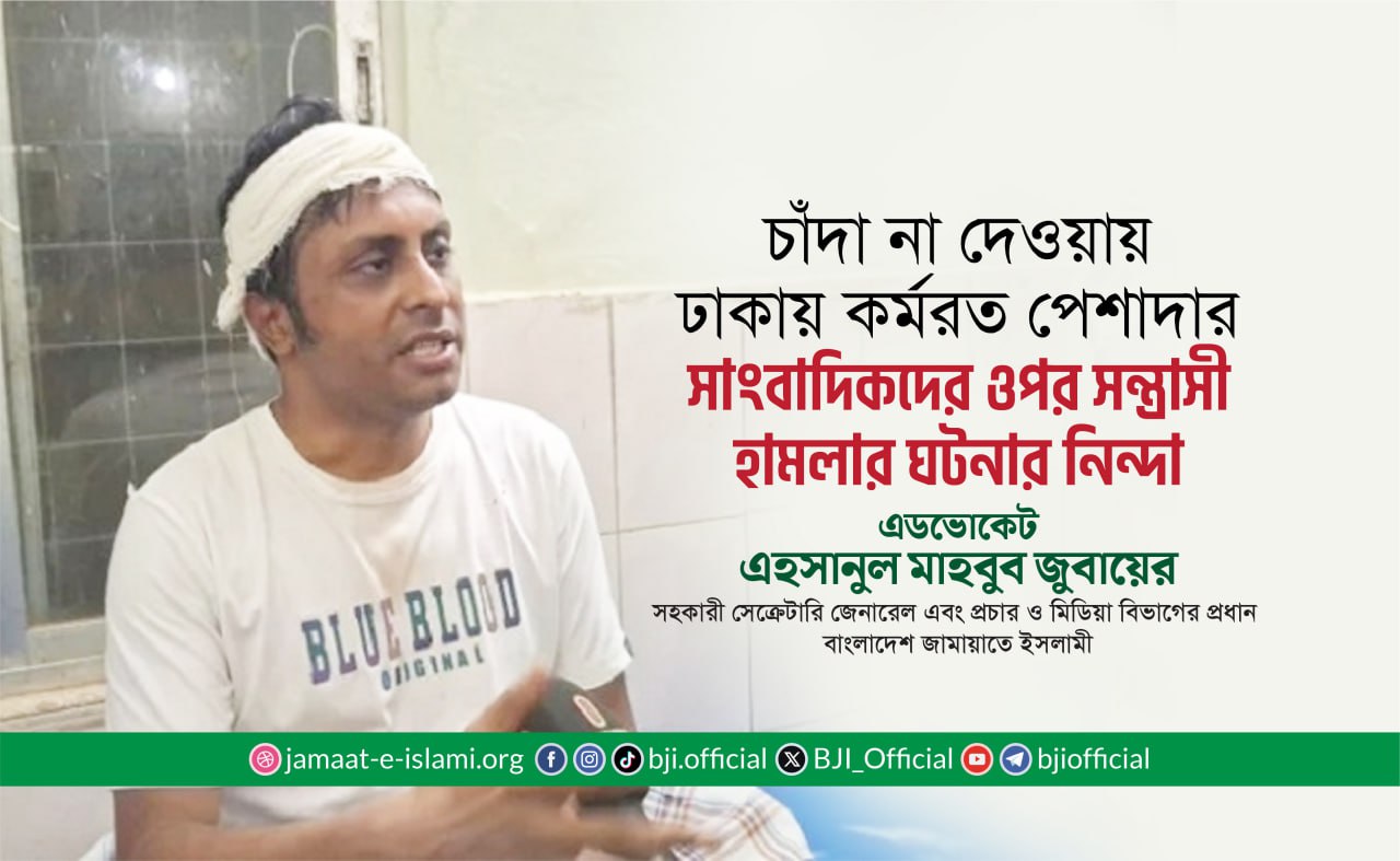 চাঁদা না দেওয়ায় নরসিংদীর ড্রিম হলিডে পার্কের সামনে ঢাকায় কর্মরত পেশাদার সাংবাদিকদের ওপর সন্ত্রাসী হামলার ঘটনার নিন্দা জানিয়ে বাংলাদেশ জামায়াতে ইসলামীর সহকারী সেক্রেটারি জেনারেল এবং কেন্দ্রীয় প্রচার ও মিডিয়া বিভাগের প্রধান এডভোকেট এহসানুল মাহবুব জুবায়ের আজ ২৬ জানুয়ারি এক বিবৃতি প্রদান করেছেন।