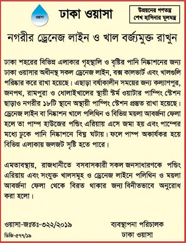 ঢাকা ওয়াসার সব নালা-খাল পরিষ্কার করা হয়েছে বলে বিজ্ঞপ্তি দিয়েছে ওয়াসা
