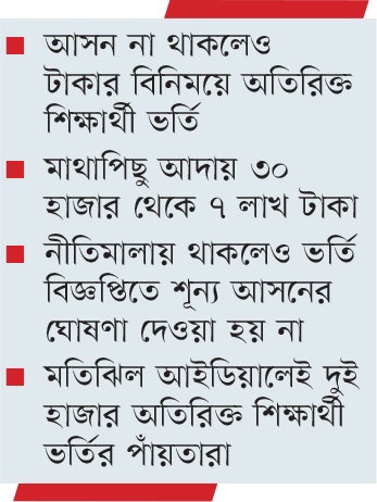পরিচালনা পর্ষদ ও গভর্নিং বডির সদস্যরা। এসব স্কুল ও কলেজে গভর্নিং বডির নির্বাচনে বিজয়ী হতে একেকজন সদস্যের ২০ থেকে ৩০ লাখ টাকা খরচ হয় বলে অভিযোগ রয়েছে। আর সদস্যরা ওই নির্বাচনী ব্যয়ের টাকা মুনাফাসহ তুলতে বড় ধরনের ভর্তি বাণিজ্যের আয়োজন করান। জানা যায়, কোনো আসন শূন্য না থাকা সত্ত্বেও মতিঝিল আইডিয়াল স্কুল অ্যান্ড কলেজে প্রথম থেকে নবম শ্রেণিতে প্রায় দুই হাজার অবৈধ শিক্ষার্থী ভর্তি করার উদ্যোগ নিয়েছে প্রতিষ্ঠানটির গভর্নিং বডির একটি অংশ। তবে অবৈধ ওই ভর্তিপ্রক্রিয়া নিয়ে গভর্নিং বডি দুই ভাগে বিভক্ত হয়ে পড়েছে। একটি পক্ষ যে কোনোভাবেই হোক অবৈধভাবে শিক্ষার্থী ভর্তি করাতে চায়। এই গ্রুপে রয়েছেন গভর্নিং বডির সদস্য মতিঝিল থানা আওয়ামী লীগের সাবেক সাধারণ সম্পাদক জাহিদুল ইসলাম টিপু। এ ছাড়া আছেন প্রতিষ্ঠানের সহকারী প্রধান শিক্ষক আবদুস সালাম খান এবং স্কুলের কর্মচারী আতিকুল ইসলাম, যিনি ইঞ্জিনিয়ার হিসেবে পরিচিত। গভর্নিং বডির জামায়াতপন্থী হিসেবে পরিচিত দুজন সদস্যও তাঁদের পক্ষে রয়েছেন। আতিকুল ইসলাম এরই মধ্যে ভর্তীচ্ছু শিক্ষার্থীদের অভিভাবকদের কাছ থেকে টাকা আদায় করতে শুরু করেছেন। তিনি মাঠে দালালও নিয়োগ করে রেখেছেন, যাঁরা শিক্ষার্থী প্রতি দুই থেকে আড়াই লাখ টাকা করে নিচ্ছেন। দু-একজন অভিভাবকও আতিকের পক্ষ হয়ে কমিশনের মাধ্যমে টাকা আদায়ে সাহায্য করছেন।