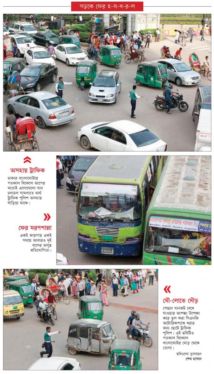 নির্দেশ নিরর্থক : প্রায় দুই বছর আগে আইন-শৃঙ্খলা পরিস্থিতি নিয়ন্ত্রণে ঢাকা মহানগর পুলিশ (ডিএমপি) কমিশনার আছাদুজ্জামান মিয়া শহরে মোটরসাইকেলে তিন যাত্রী বহন করা যাবে না বলে নির্দেশ দেন। এ ছাড়া আদালতের নির্দেশনা আসে গাড়িতে পুলিশ, সাংবাদিক, প্রেস, আইনজীবী, চিকিৎসকসহ পেশাগত স্টিকার ব্যবহার করা যাবে না। জরুরি কাজের জন্য সাংবাদিক ও পুলিশকে পেশা নয়, প্রতিষ্ঠানের স্টিকার ব্যবহার করতে বলা হয়। প্রচলিত গণমাধ্যমগুলো এ নির্দেশনা মানলেও ঢাকায় প্রেস ও সাংবাদিক স্টিকারের শত শত গাড়ি দেখা যায়। পুলিশ, চিকিৎসক, আইনজীবীসহ অন্যান্য পেশার স্টিকার লাগানো হচ্ছে দেদার। এ ছাড়া প্রায়ই ফুটপাত ব্যবহার, ফুট ওভারব্রিজ ব্যবহার এবং যত্রতত্র রাস্তা পার না হওয়ার ব্যাপারে কর্মসূচি নেয় ট্রাফিক পুলিশ। দু-এক দিন এই কার্যক্রম দেখা গেলেও পরিকল্পিত কোনো কার্যক্রম নেই। মঙ্গলবার বনানীর ফুট ওভারব্রিজের কাছে হেঁটে রাস্তা পার হওয়ার সময় আব্দুল করিম নামের এক পথচারী বলেন, এই ওভারব্রিজটিতে লিফট থাকলেও প্রায় সময়ই বন্ধ থাকে। কাকলীর রাস্তায় নামা বন্ধ করা হয়েছে। অথচ এখানে খোলা। পুলিশ ব্যবস্থা না নিলে এত দূরে গিয়ে ওভারব্রিজে কে উঠবে!