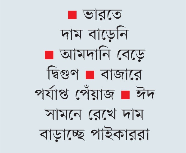 দেশি পেঁয়াজের বাইরে বর্তমানে ভোক্তার চাহিদা অনুযায়ী আমদানি করা হয় ভারত থেকে। ভারতের বাজারে পেঁয়াজের দাম স্থিতিশীল রয়েছে। আমদানিতেও কোনো সমস্যা নেই। ২০১৬ সাল থেকে সরকার পেঁয়াজ আমদানির ওপর থেকে শুল্ক প্রত্যাহার করে নিয়েছে। বর্তমানে বাজারে পর্যাপ্ত পেঁয়াজও রয়েছে। তার পরও এক সপ্তাহ ধরে বাড়ছে পেঁয়াজের দাম। মূলত আসন্ন ঈদুল আজহাকে কেন্দ্র করে পাইকারি ব্যবসায়ীরা সিন্ডিকেট করে বাড়িয়ে দিচ্ছে পেঁয়াজের দাম, যার নেতিবাচক প্রভাব পড়ছে খুচরা বাজারে। আর আর্থিকভাবে ক্ষতিগ্রস্ত হচ্ছে ভোক্তাসাধারণ। বেনাপোল, দিনাজপুর ও চট্টগ্রাম থেকে কালের কণ্ঠ’র প্রতিনিধিদের পাঠানো প্রতিবেদন :