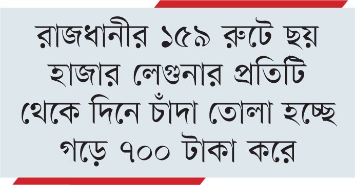 একই স্থানে চার দফায় চাঁদাবাজি : একই সংগঠনের নামে মহাখালী ফ্লাইওভারের নিচে একেকটি লেগুনা থেকে দিনে চার দফায় ৬০ টাকা করে ২৪০ টাকা চাঁদা নেওয়ার অভিযোগ আছে। লেগুনাচালকরা জানান, ঢাকা জেলা হালকা যানবাহন সড়ক পরিবহন ইউনিয়নের (ঢাকা- ২১২৪) বনানী, তেজগাঁও, শিল্পাঞ্চল ও কাফরুল থানা কমিটির নামে এই চাঁদা নেওয়া হয়। ওই সংগঠনের সাধারণ সম্পাদক মোখলেছুর রহমান গত রাতে ফোনে বলেন, ‘আমাদের সংগঠন কোনো অনিয়মের সঙ্গে যুক্ত নয়। আমাদের সংগঠনের সদস্যদের কাছ থেকে দিনে ২০ টাকা নেওয়ার নিয়ম রয়েছে। এ জন্য ছাপানো রসিদও আছে। কিন্তু মহাখালীতে যে চাঁদাবাজি হচ্ছে তা আমাদের কাছে কেউ অভিযোগ করেনি। তাহলে আমরা বিষয়টির তদন্ত করে দেখতাম।’